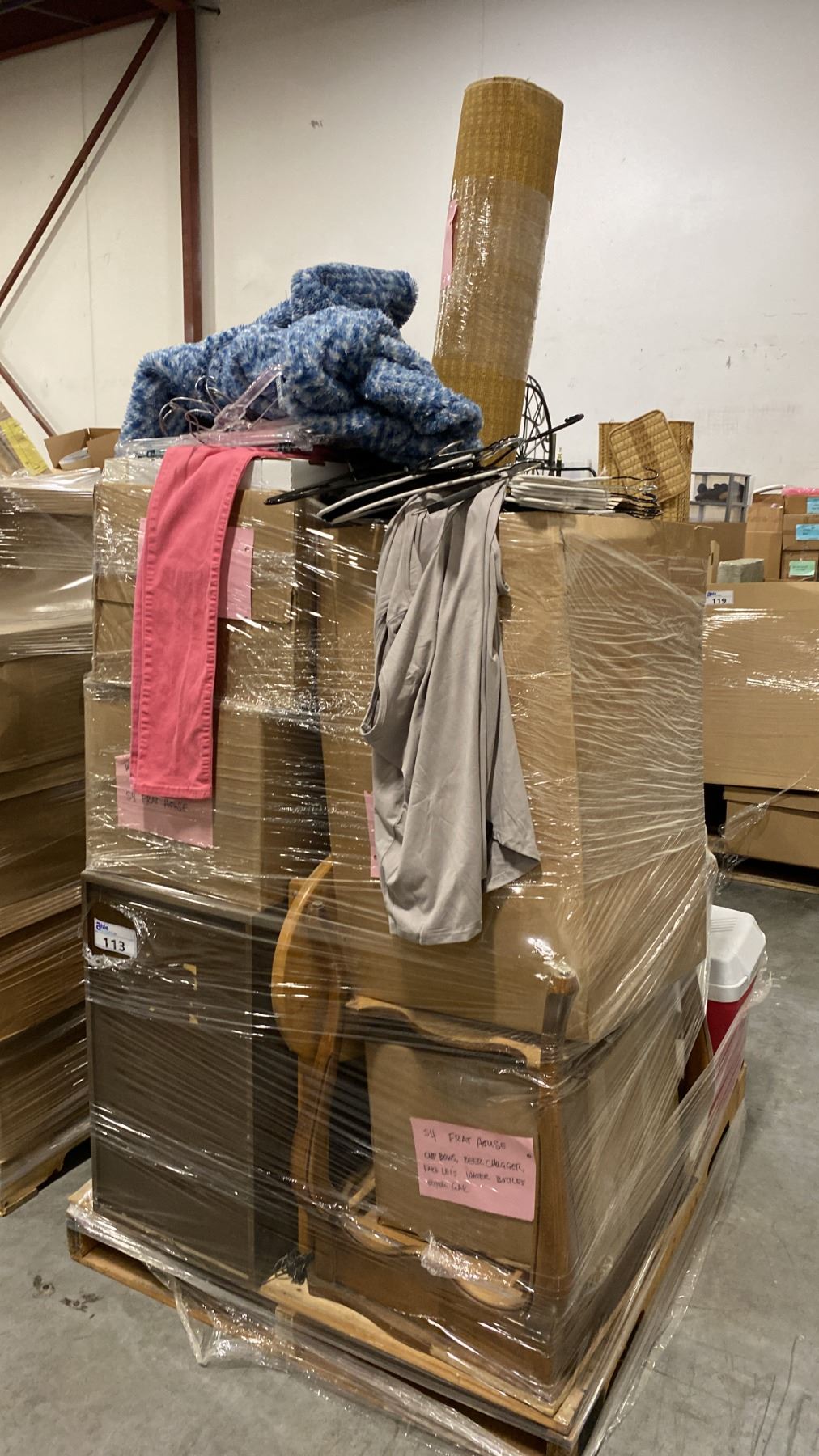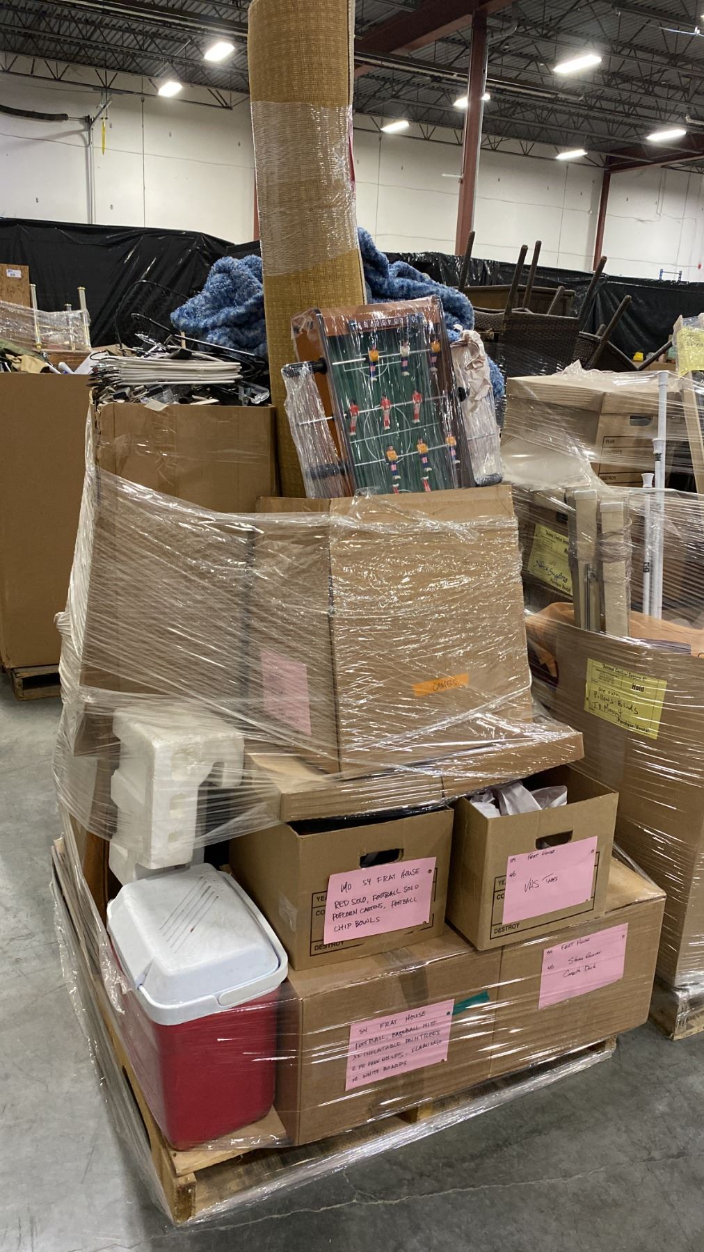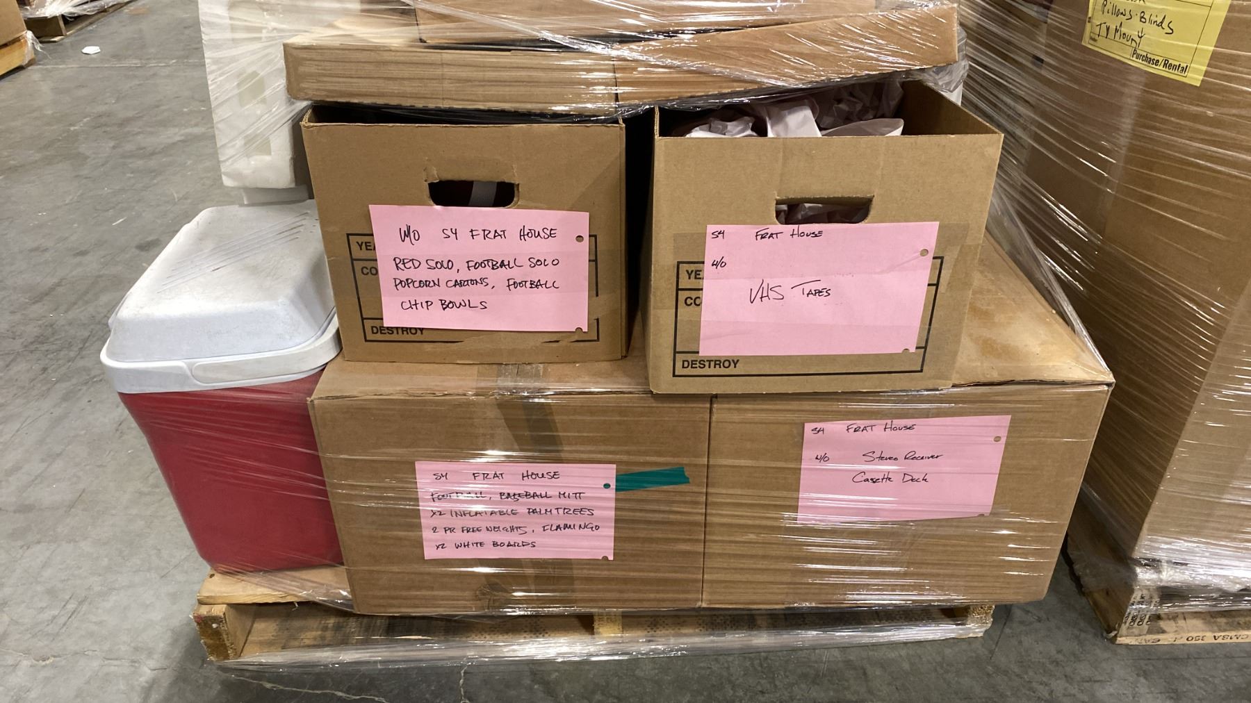 PALLET OF SET DEC PROPS/DECORATIONS - FURNITURE, CLOTHES, VHS TAPES, CHIP BOWLS, WHITE BOARDS & MORE *MUST TAKE ALL*