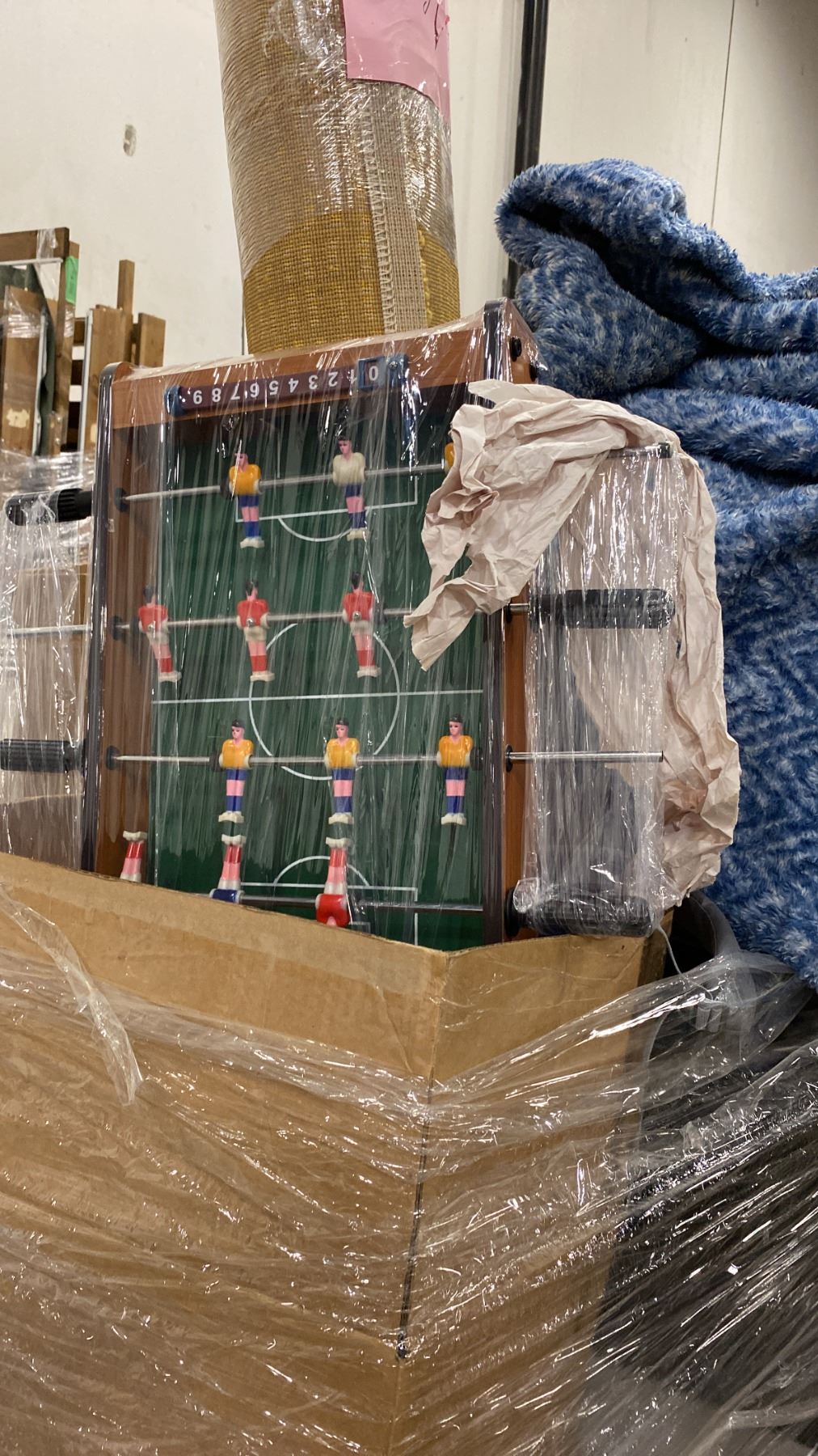 PALLET OF SET DEC PROPS/DECORATIONS - FURNITURE, CLOTHES, VHS TAPES, CHIP BOWLS, WHITE BOARDS &