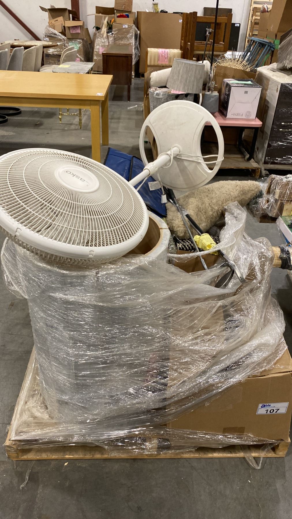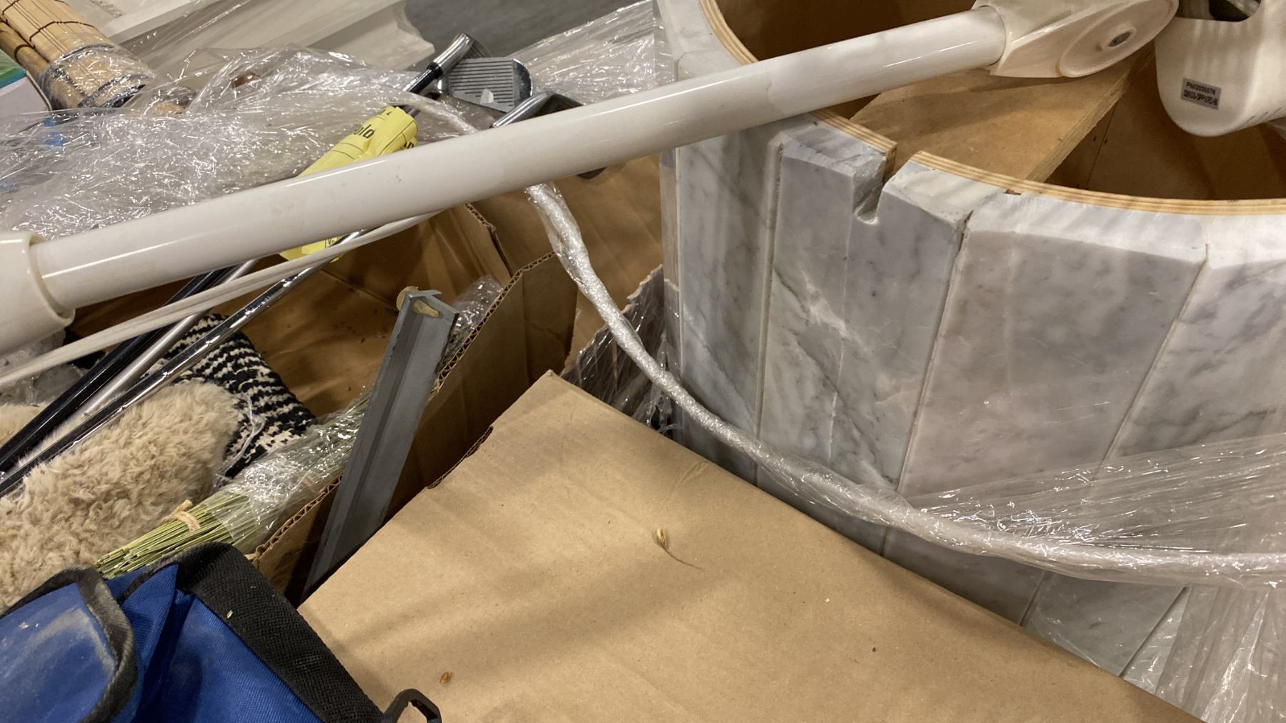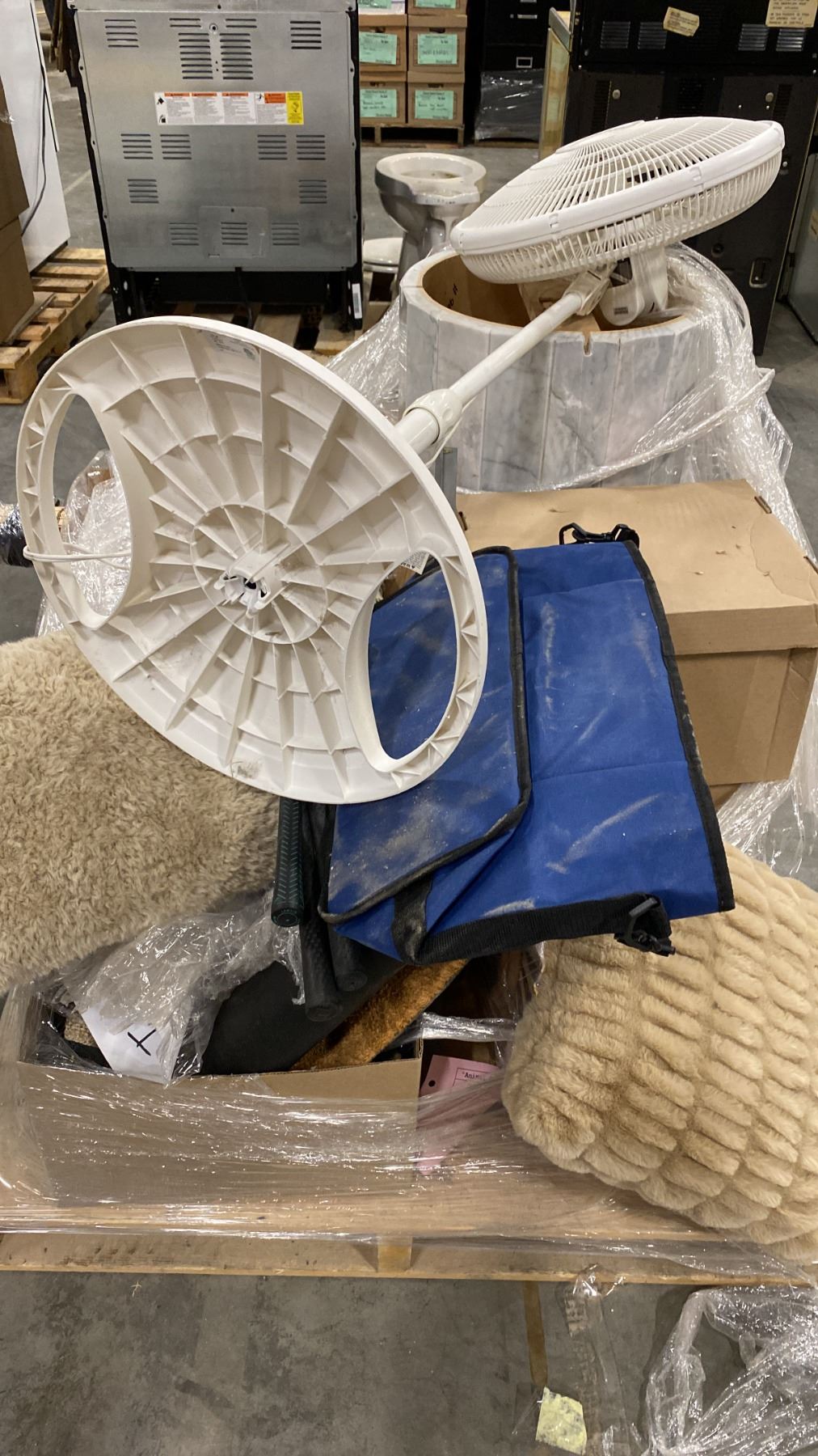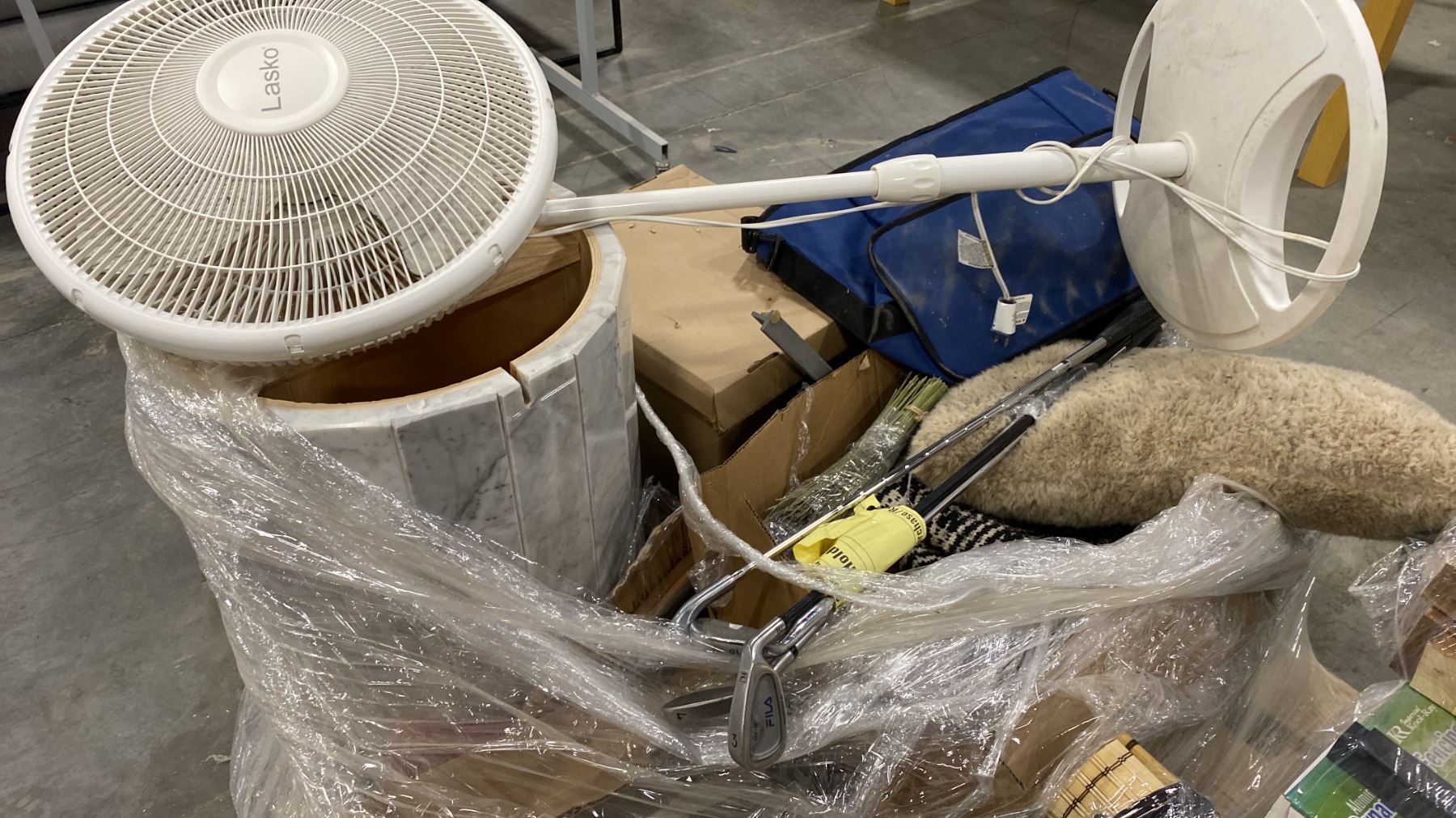 PALLET OF SET DEC PROPS/DECORATIONS - GOLF CLUBS, OSCILLATING FAN, THROW CUSHIONS, BOOKS, FRAMES & MORE *MUST TAKE ALL*