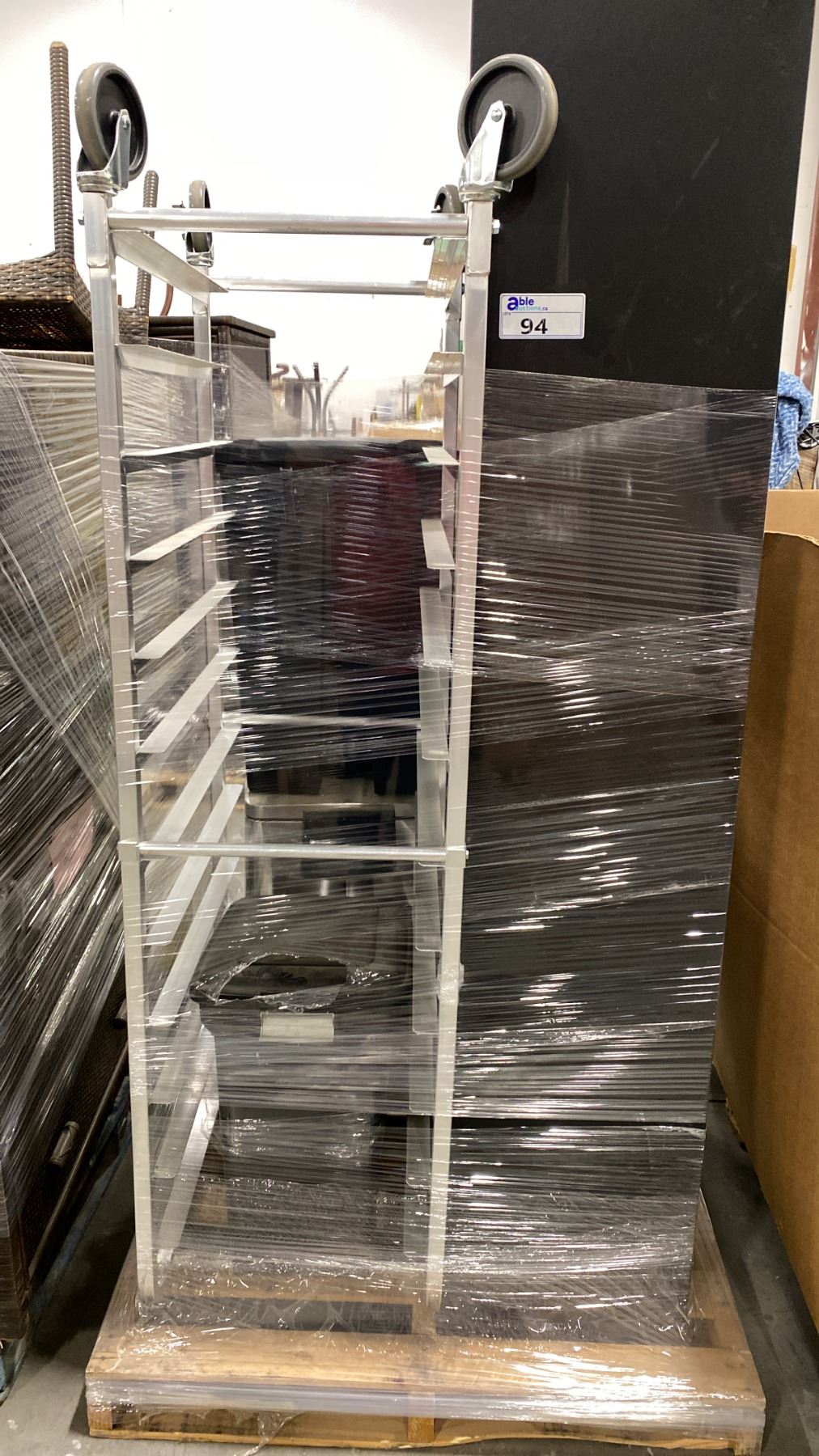 PALLET OF SET DEC PROPS/DECORATIONS - METAL TWO DOOR STORAGE CABINET, BAKERS RACK, TOTES & MORE *MUST TAKE ALL*
