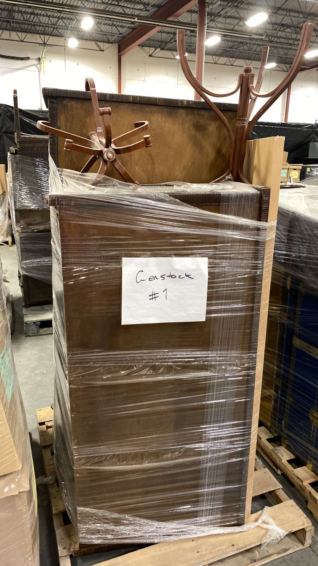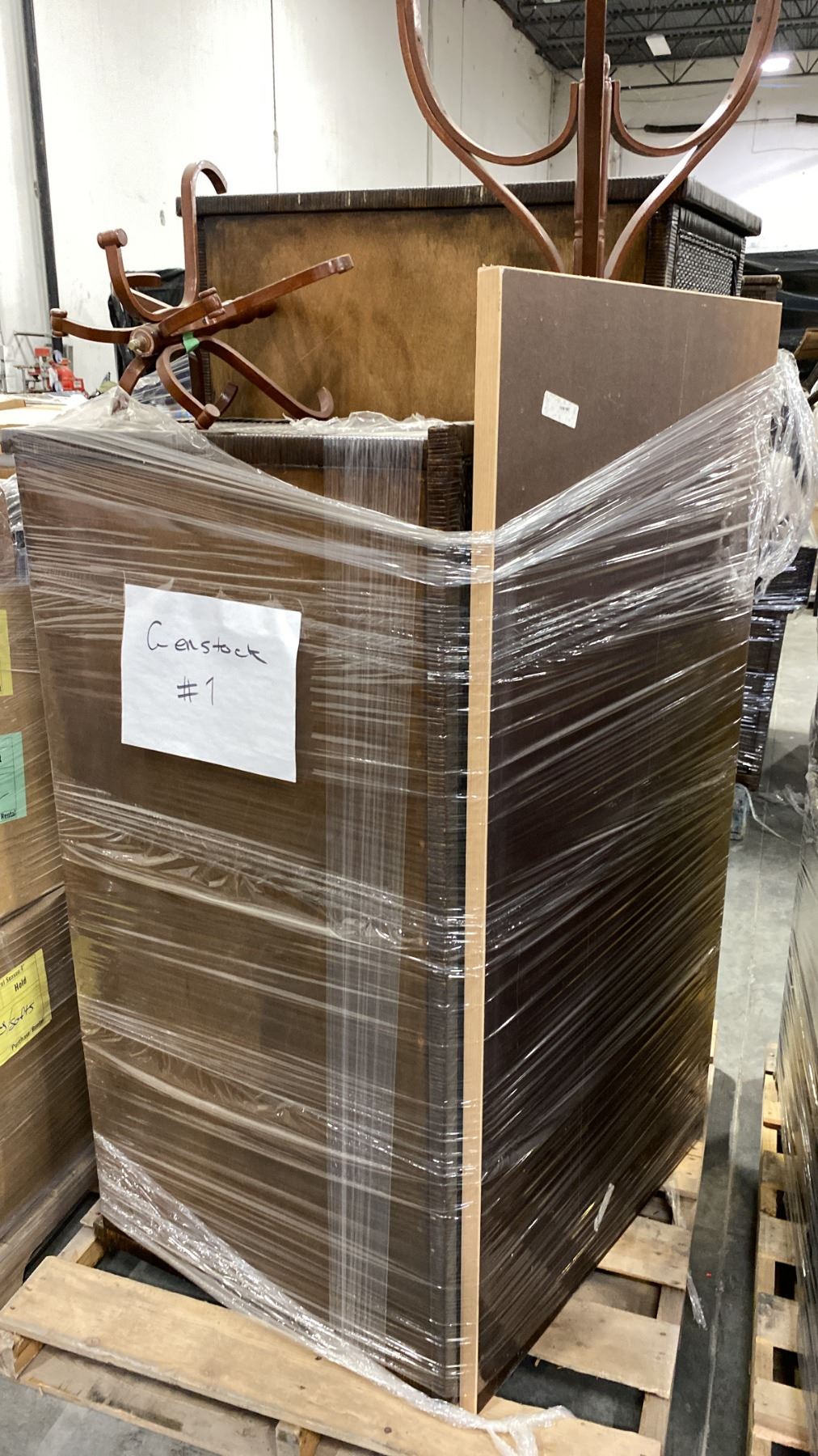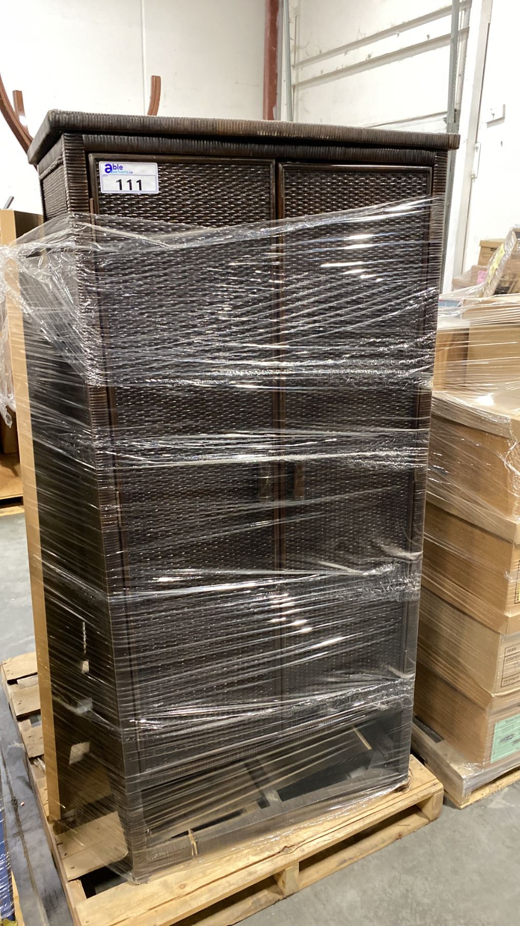 PALLET OF SET DEC PROPS/DECORATIONS - RATTAN LOOK DRESSER, RATTAN LOOK STORAGE CABINET, COAT RACK *MUST TAKE ALL*