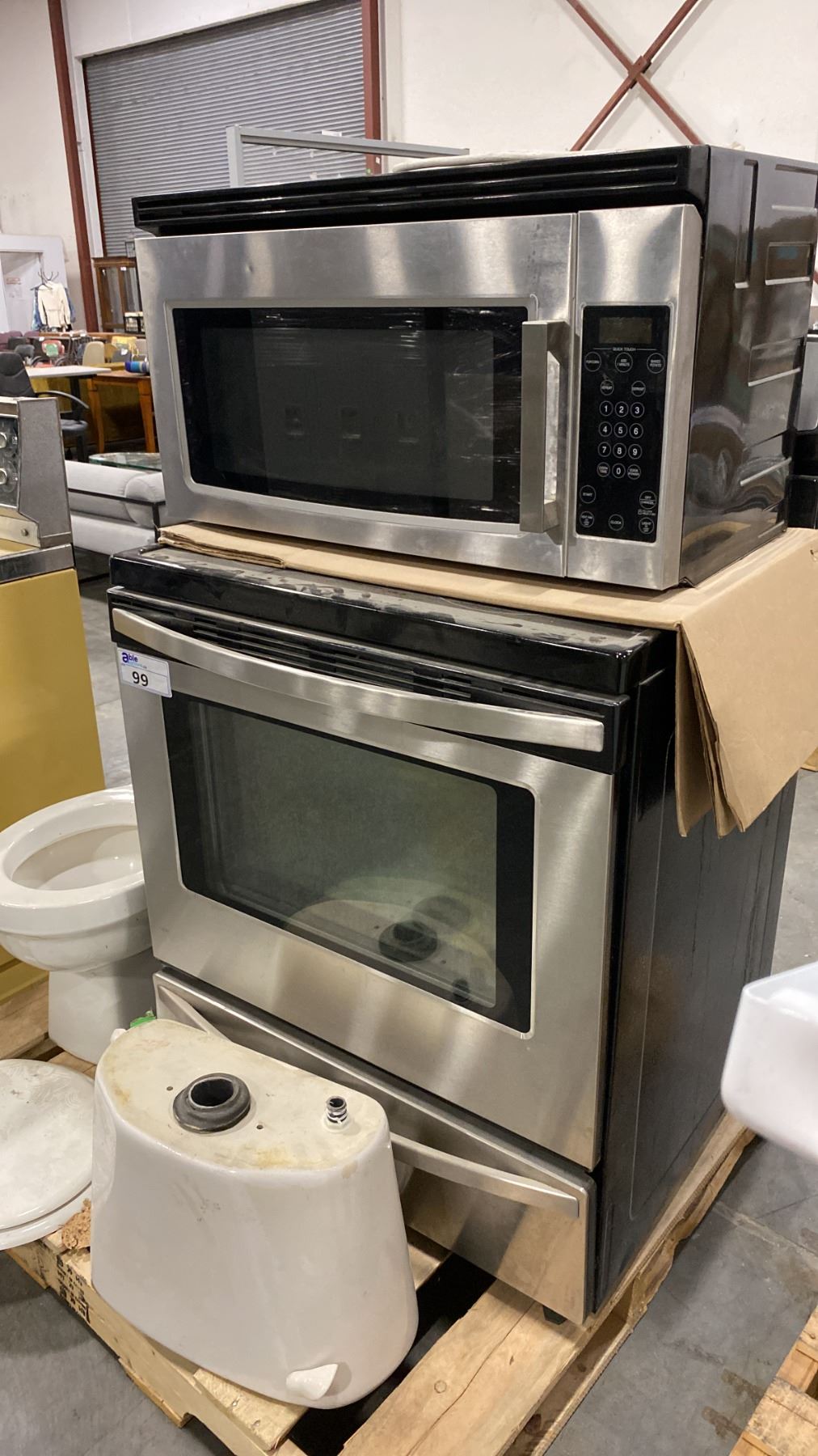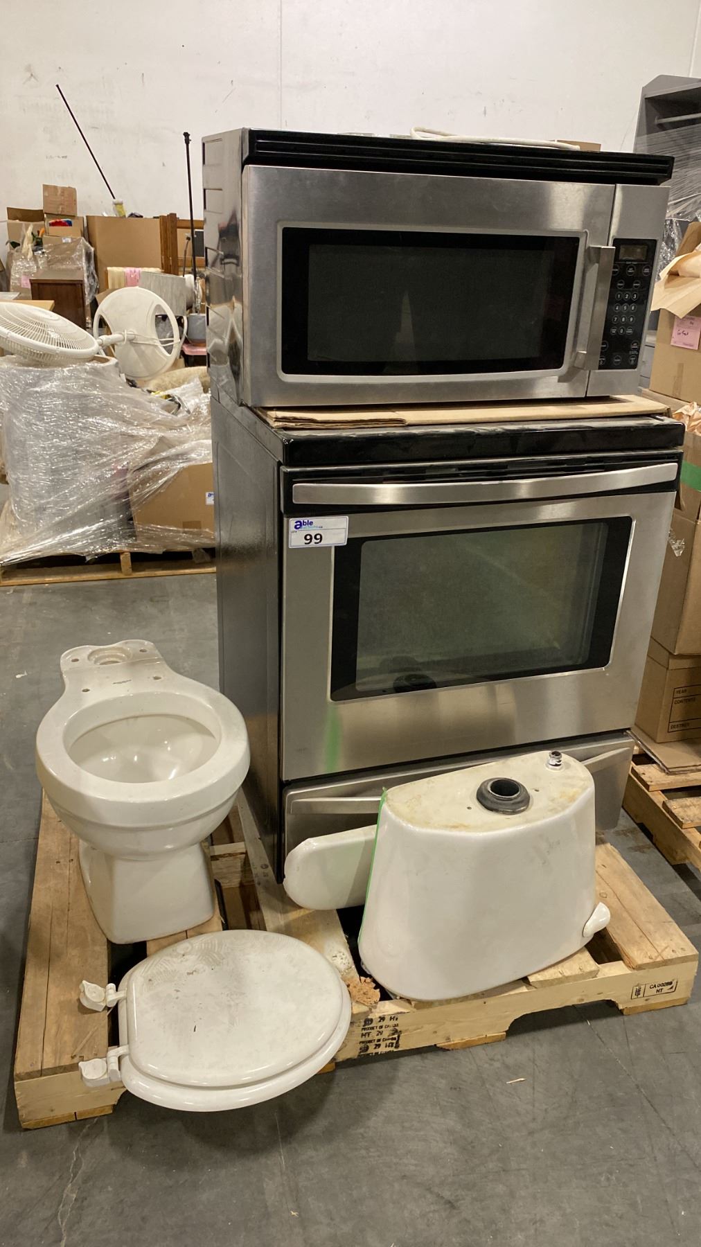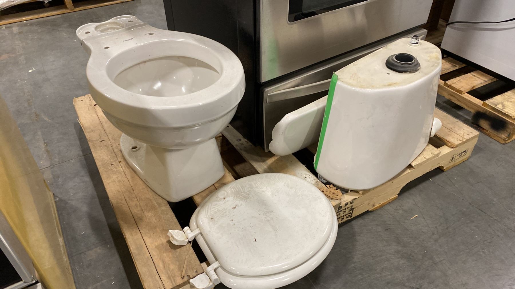 PALLET OF SET DEC PROPS/DECORATIONS - STAINLESS STEEL OVEN + MICROWAVE *WORKING CONDITION UNKNOWN* & TOILET