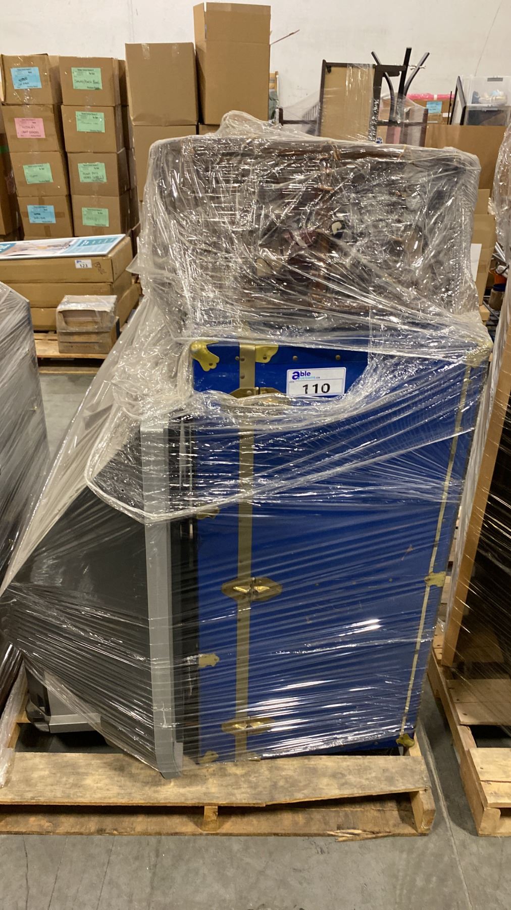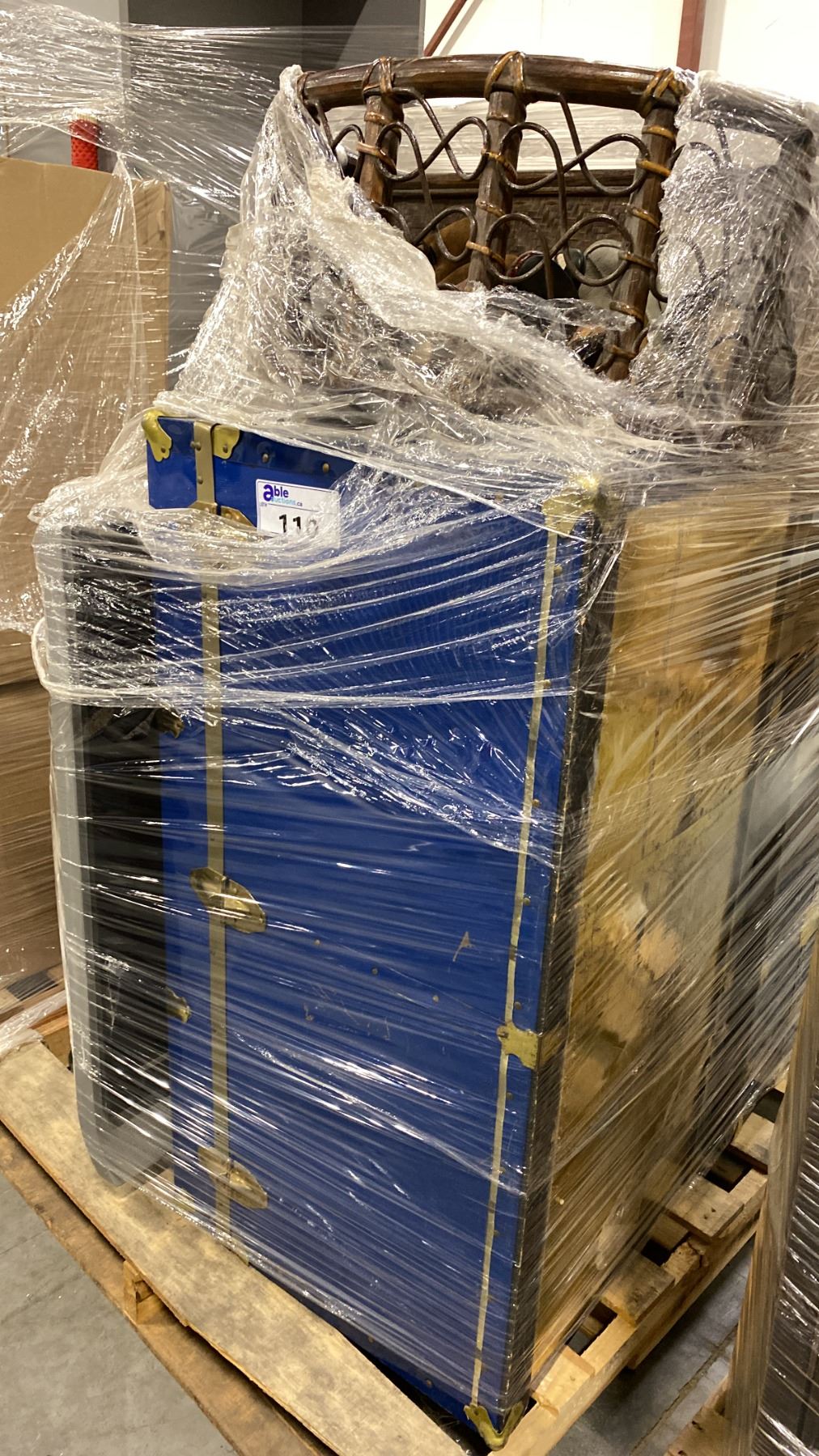 PALLET OF SET DEC PROPS/DECORATIONS - VINTAGE CHESTS, JVC HD-52Z575 TELEVISION, SHELF, SHOES & MORE
