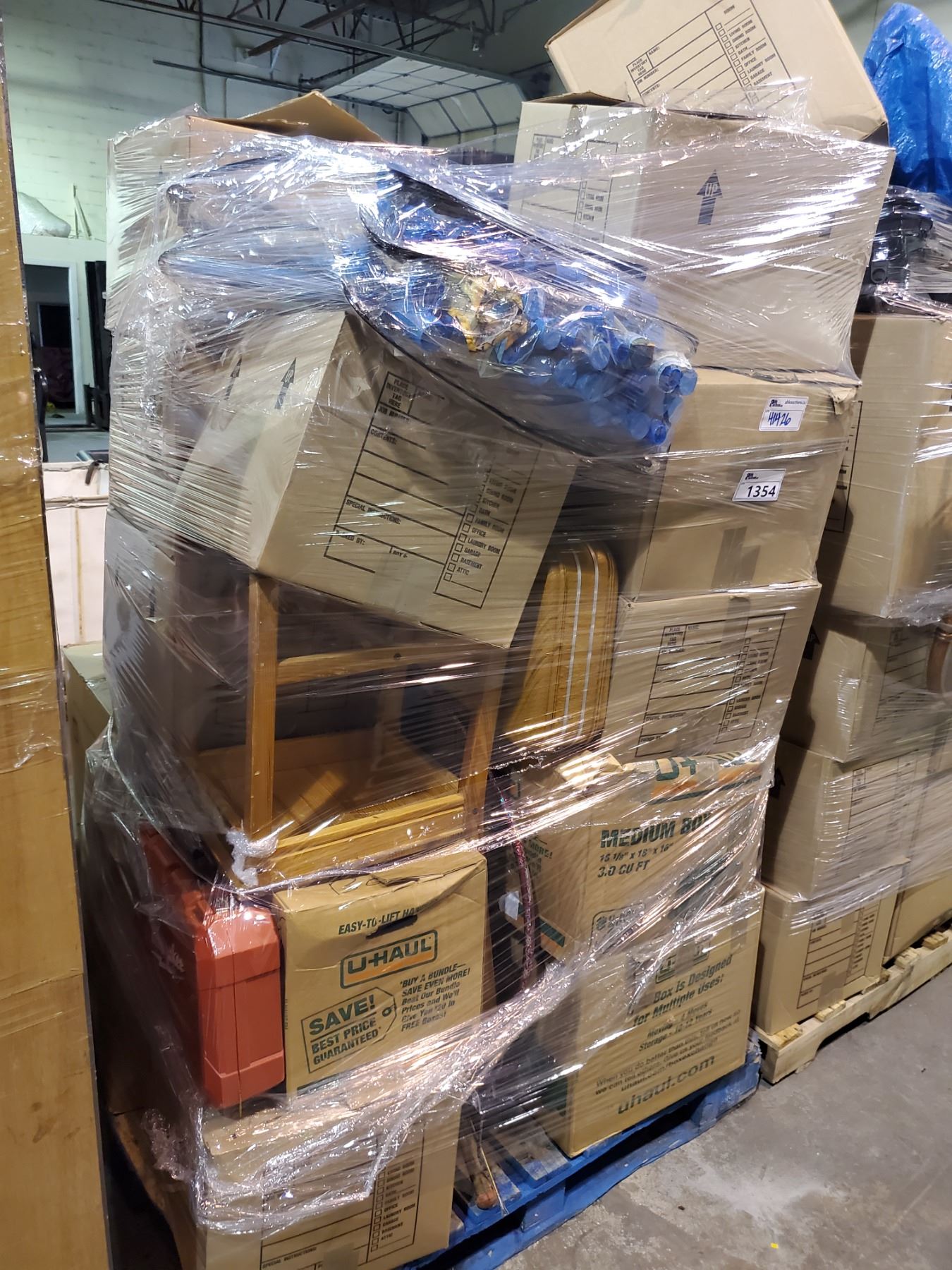PALLET OF STORAGE LOCKER CONTENTS CLOTHES, CHAIR, MILWAUKEE CASE, SUITCASE, AND MORE