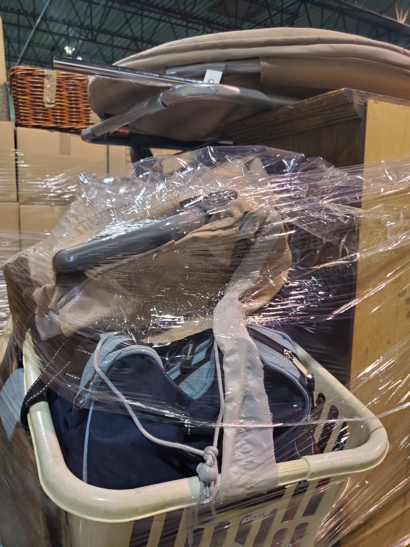 PALLET OF STORAGE LOCKER CONTENTS CLOTHES, SUITCASES, CURIO CABINET, AND MORE