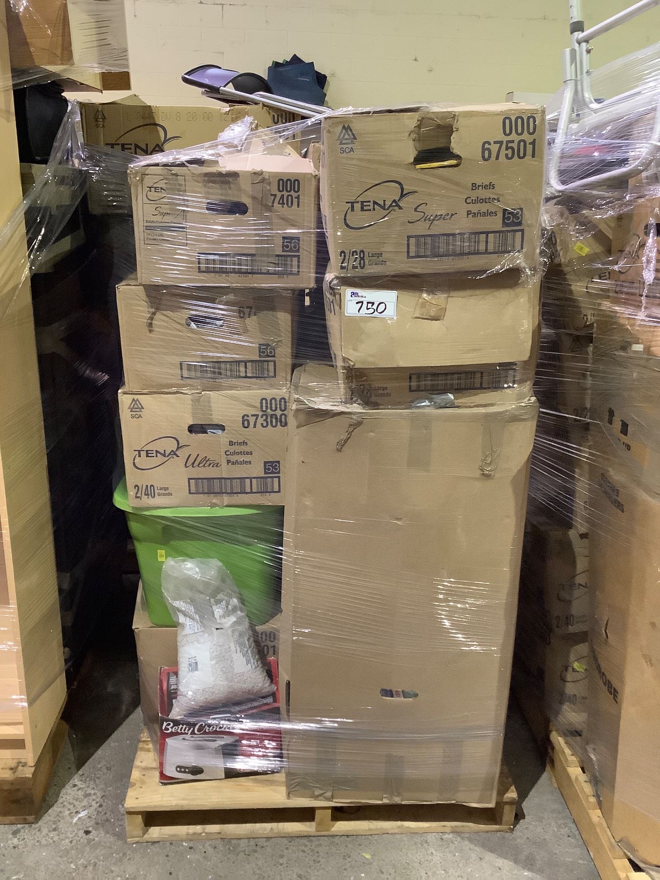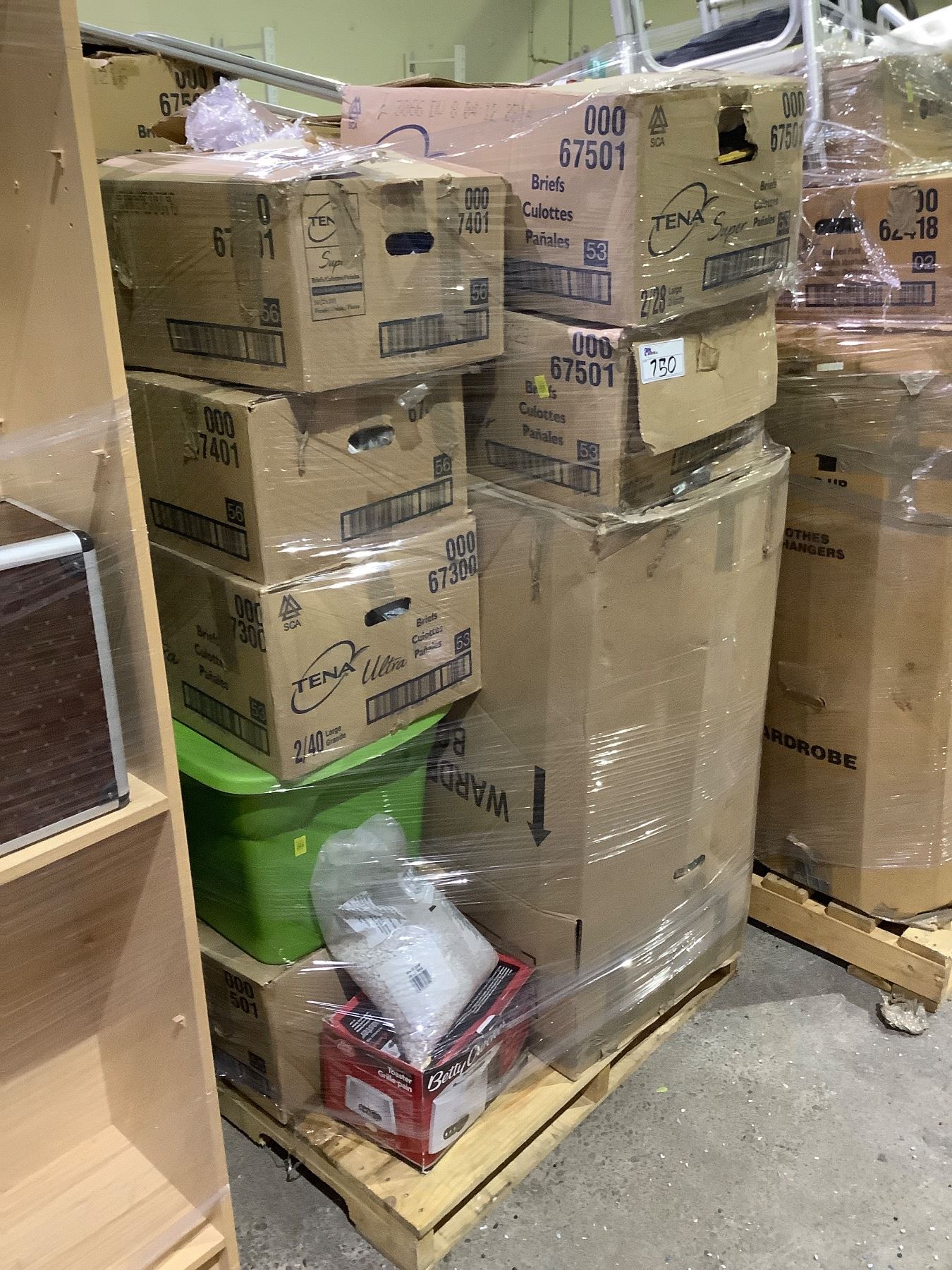 PALLET OF STORAGE LOCKER CONTENTS INCLUDING; CLOTHING, FOLDING CHAIR, PEA STONE & MORE