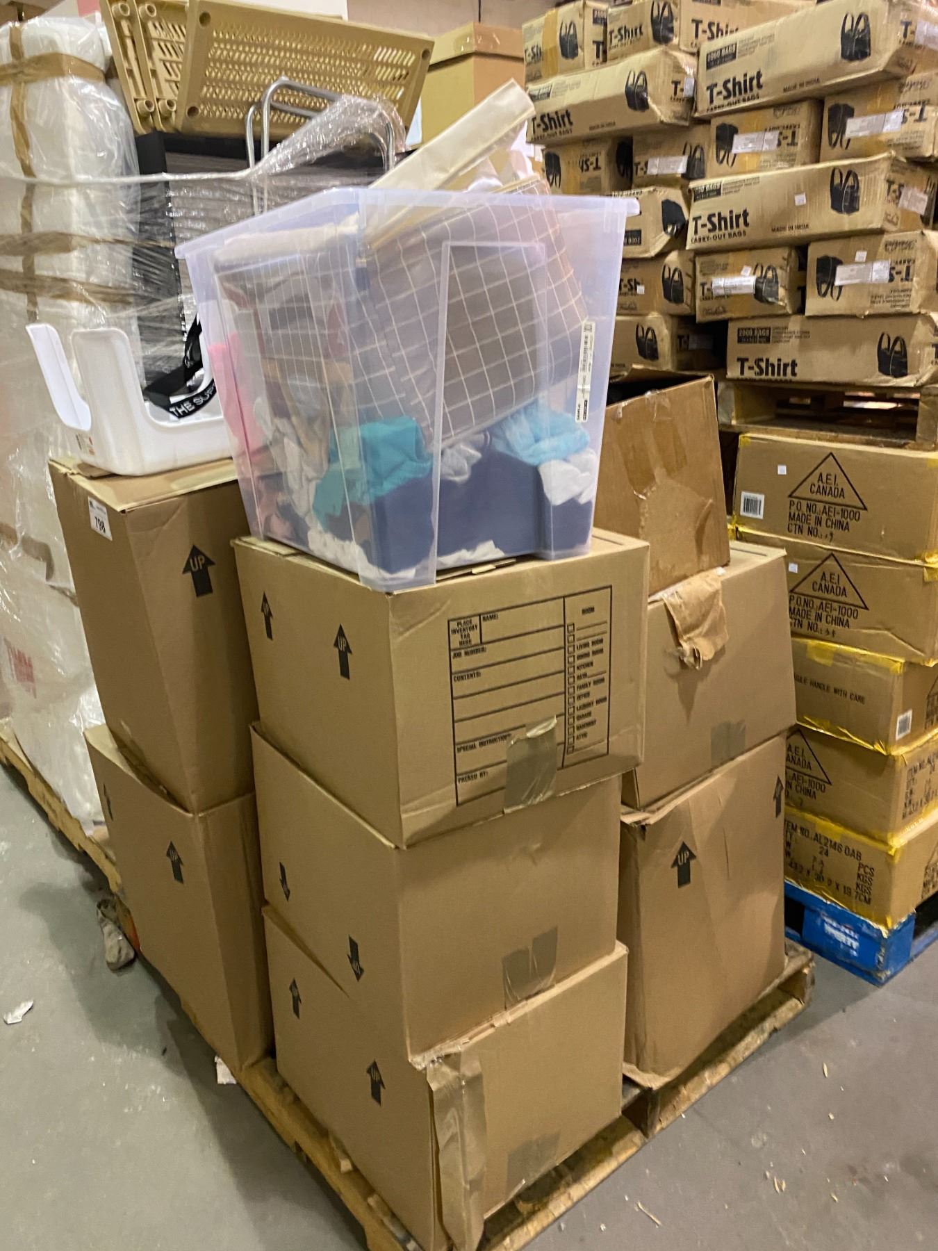 PALLET OF STORAGE LOCKER GOODS, CLOTHING, STOOL, AND MORE