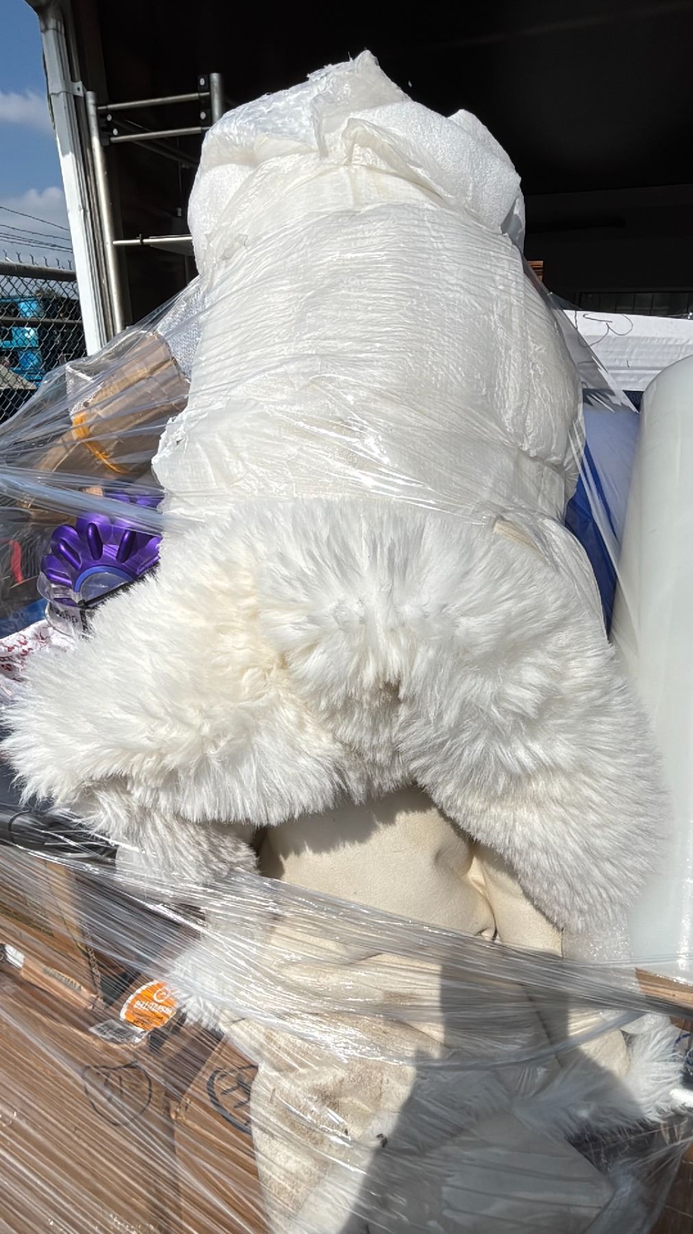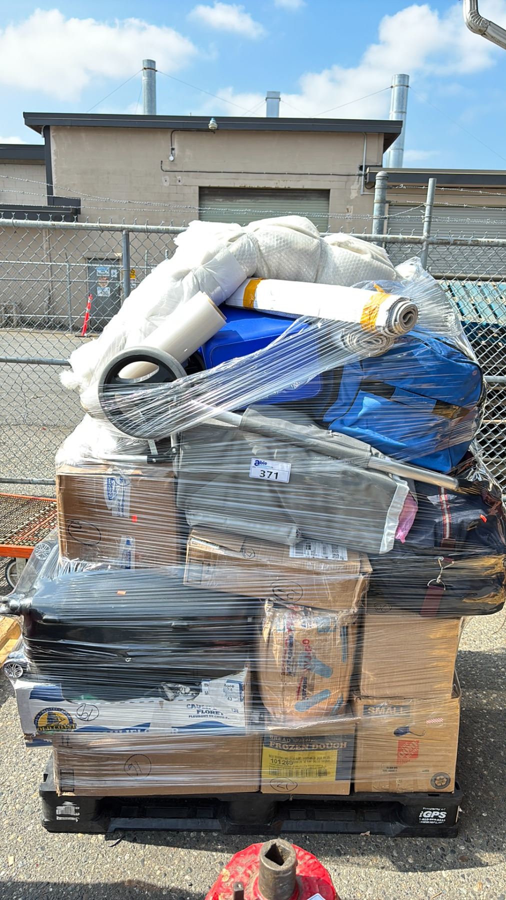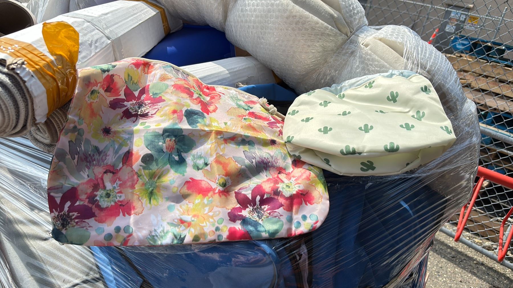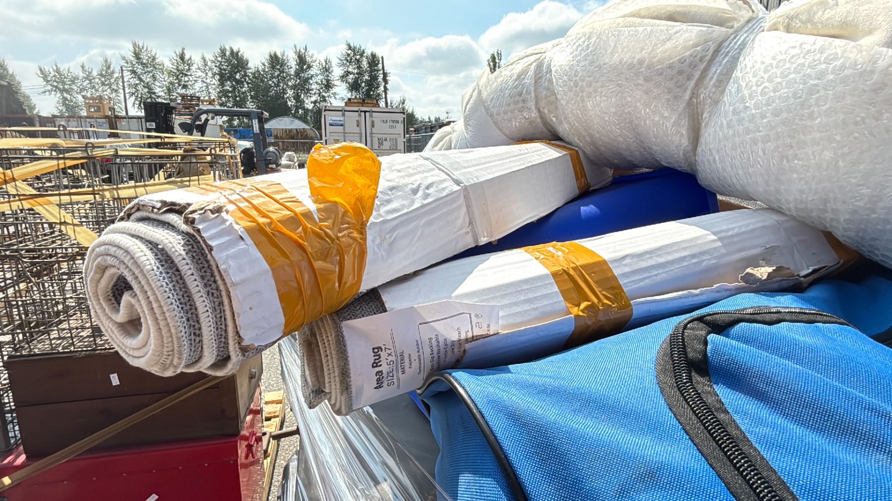 PALLET OF STORAGE LOCKER GOODS - SUITCASES, GROCERY CART, AREA RUGS, RECYCLING BIN, LEATHER BACK PACK & MORE *MUST TAKE ALL ON PALLET*