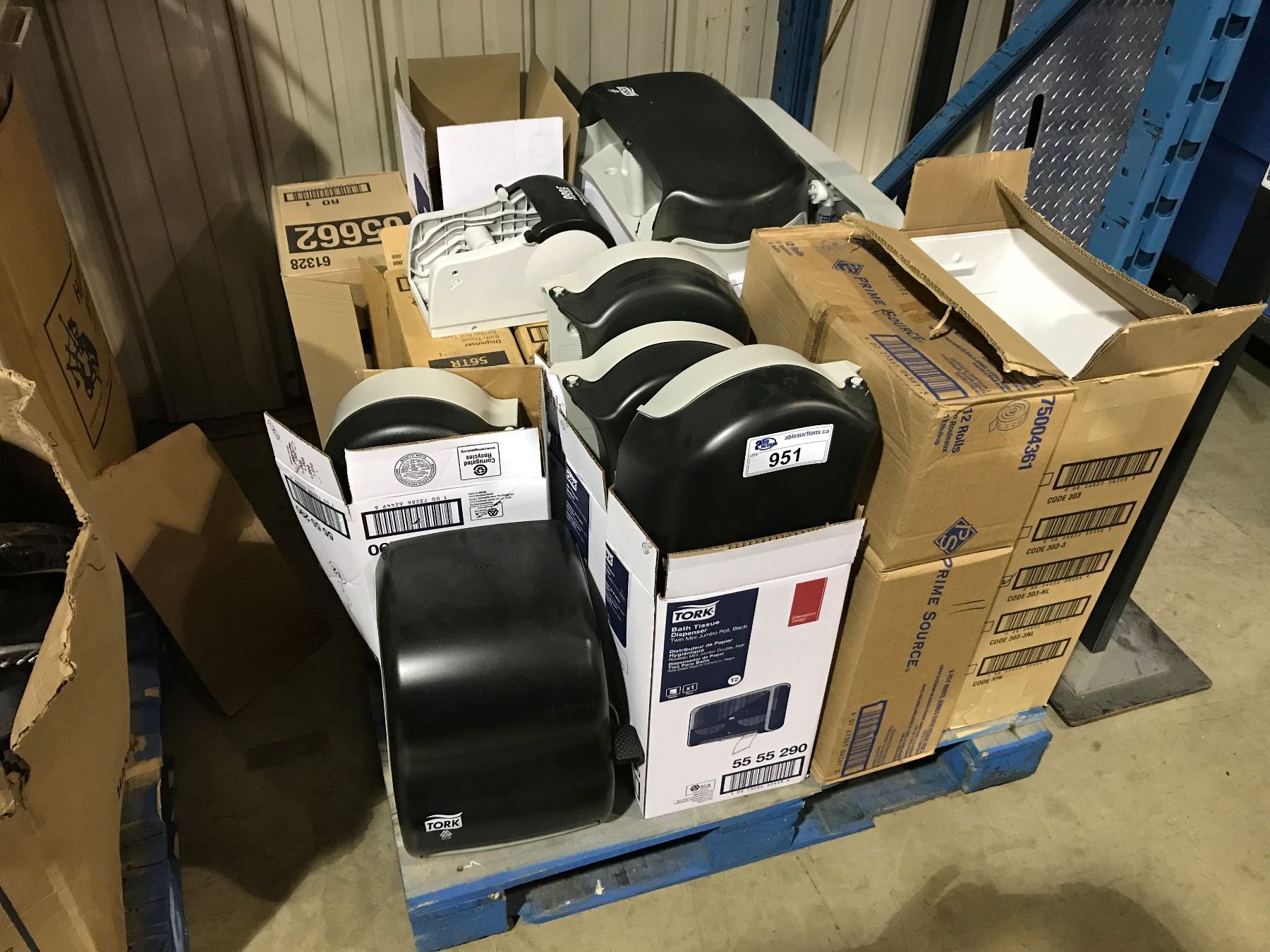 PALLET OF TORK ASSORTED TOILET PAPER AND PAPER TOWEL DISPENSERS