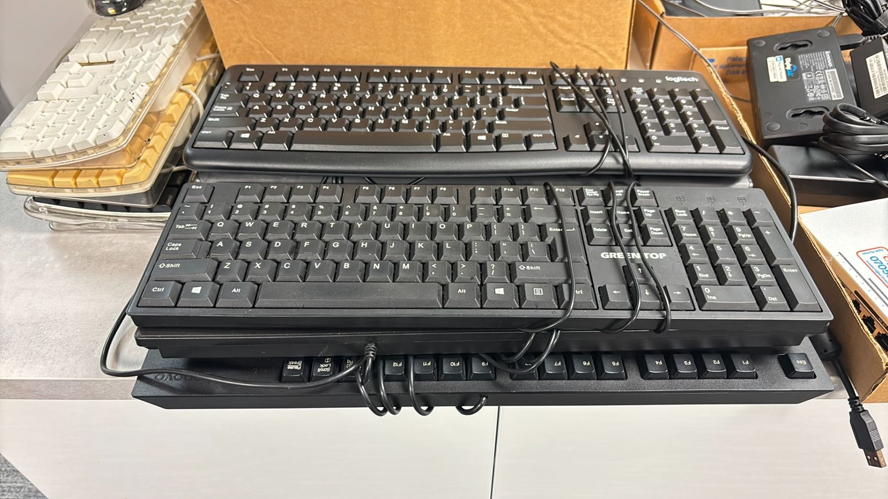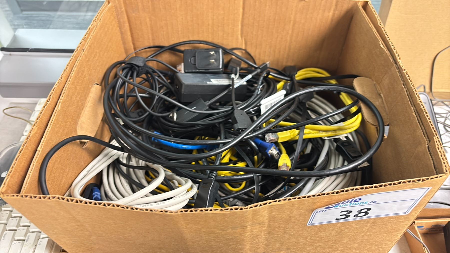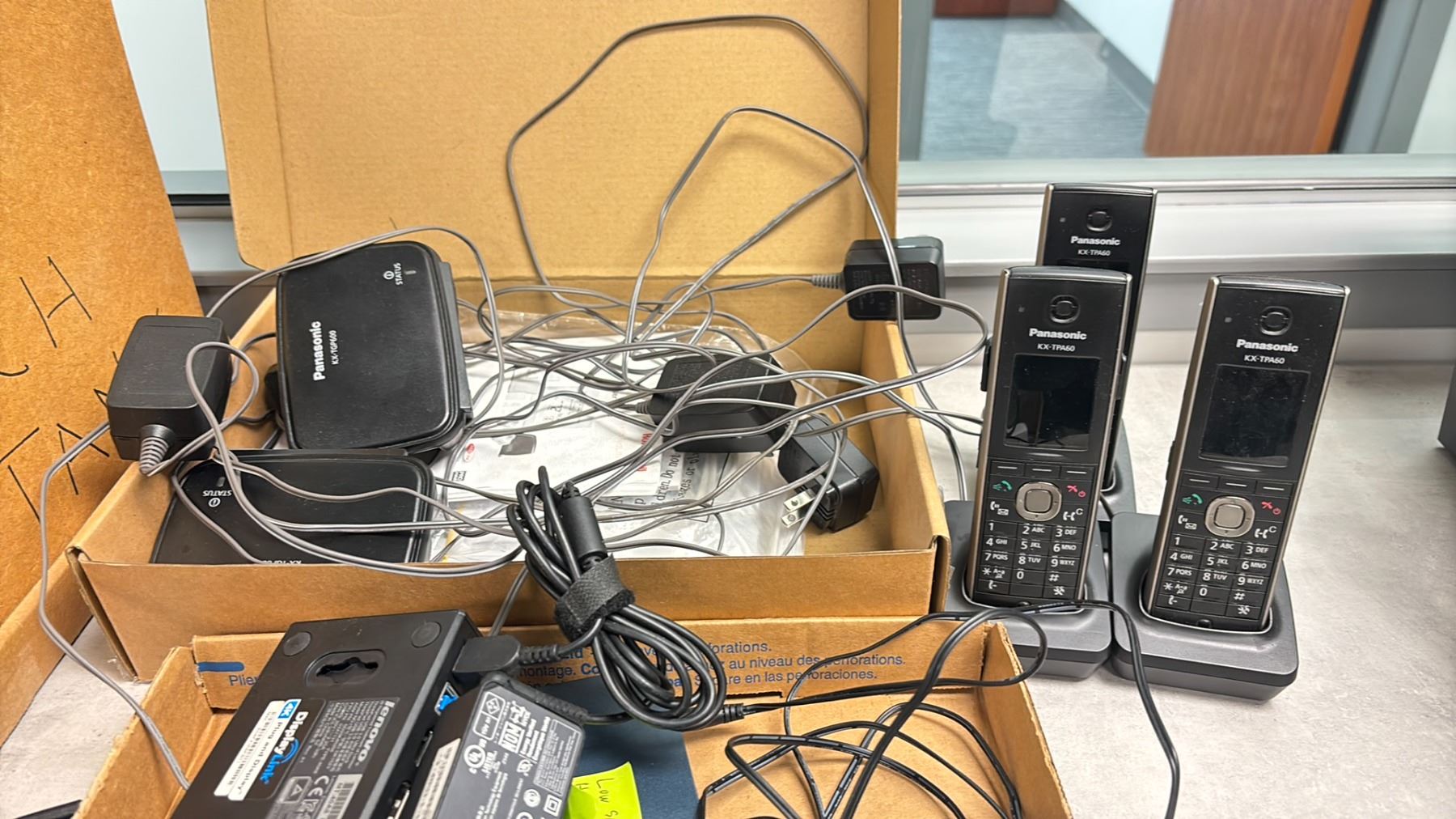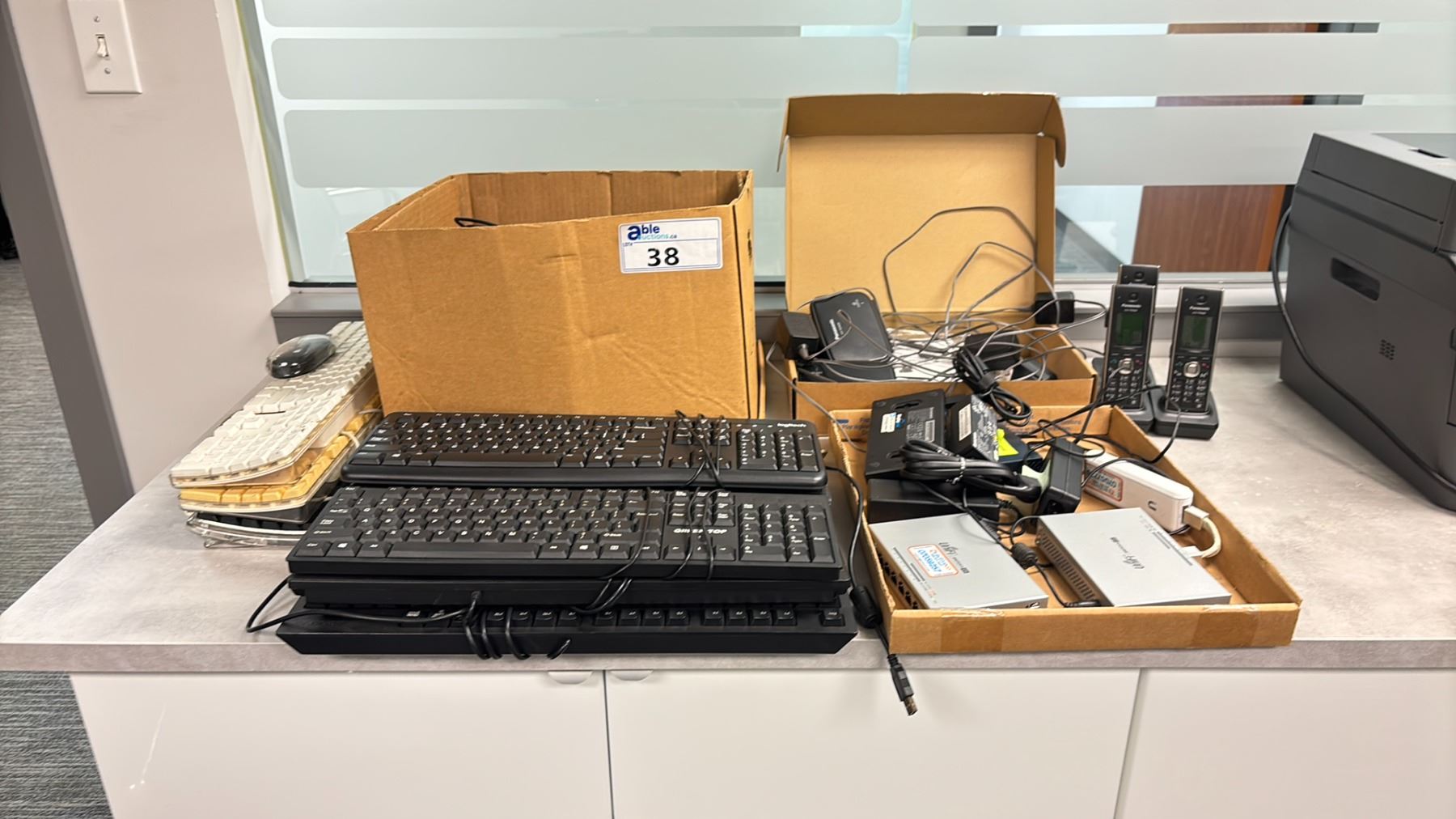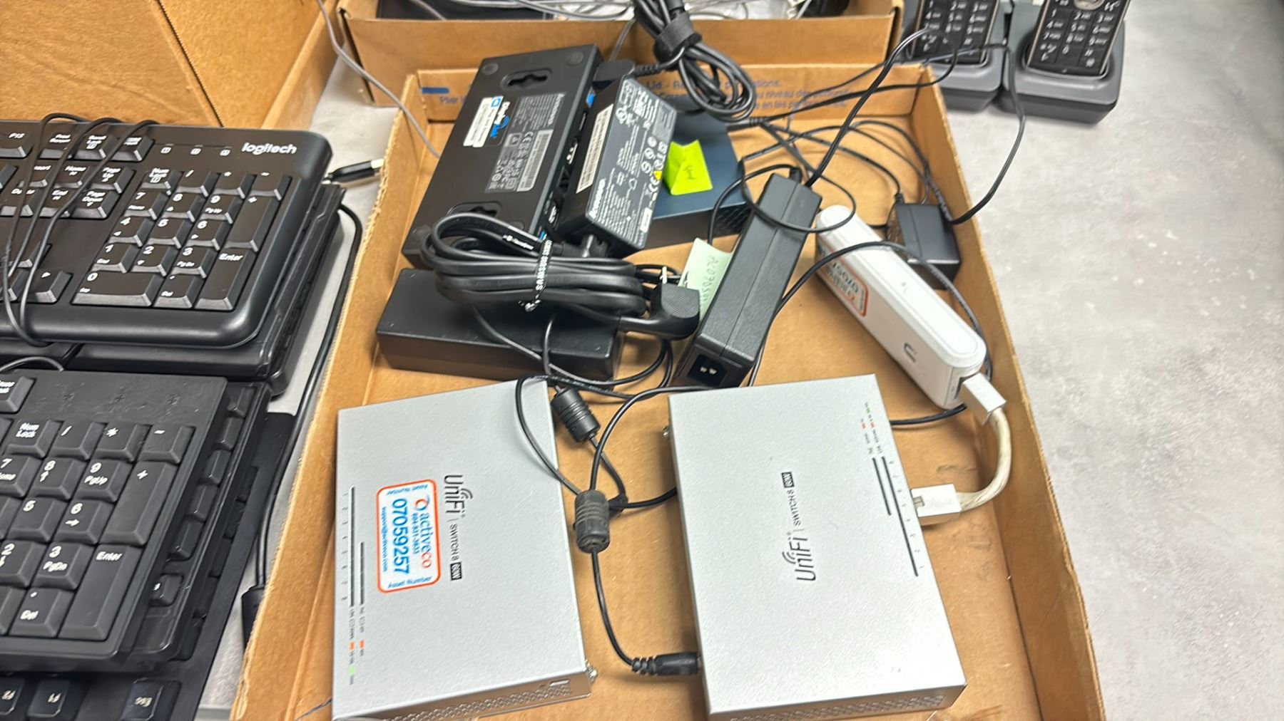 PANASONIC KX-TPA60 WIRELESS PHONES, PANASONIC KX-TGP600 BASE UNIT, UNIFI ETHERNET INDUSTRIAL SWITCHES, 9 ASSORTED KEYBOARDS, A BOX OF ASSORTED POWER CORDS, INTERNET CABLES & ELECTRICAL CORDS