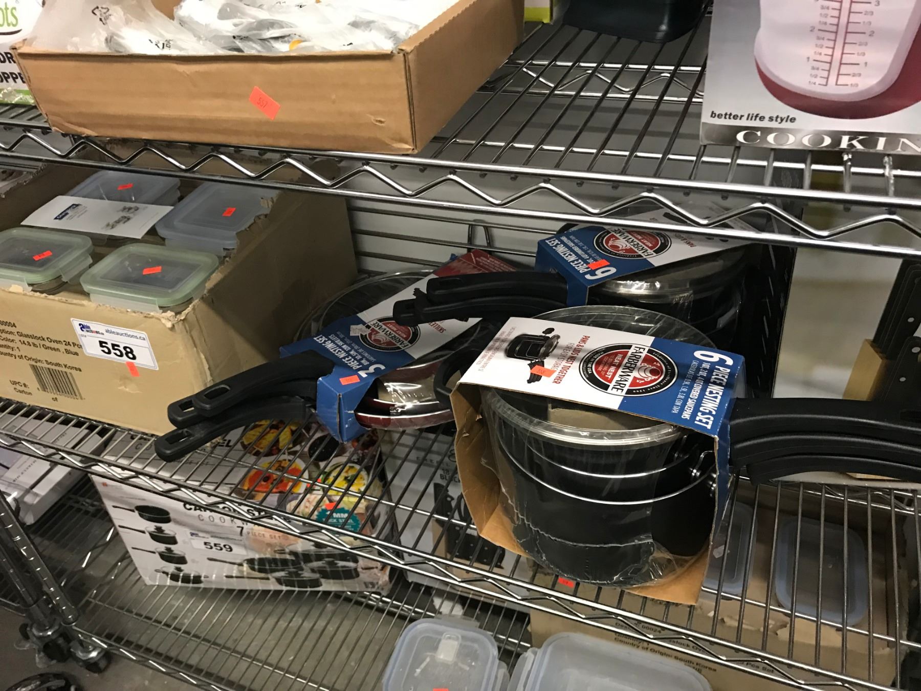 PANS, LIDS, EMERIL LAGASSE KNIFE BLOCK, GLASS CONTAINERS