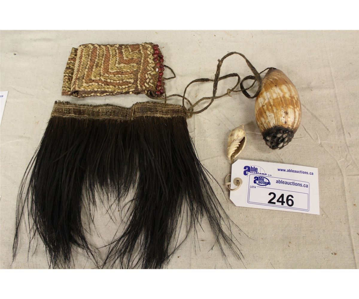PAPAU NEW GUINEA ARTIFACT BELT, ARSE GRASS AND SHELL PENIS SHEATH WITH PICTURE OF THE TRIBESMEN THAT ERIC PURCHASED THE SHELL FROM