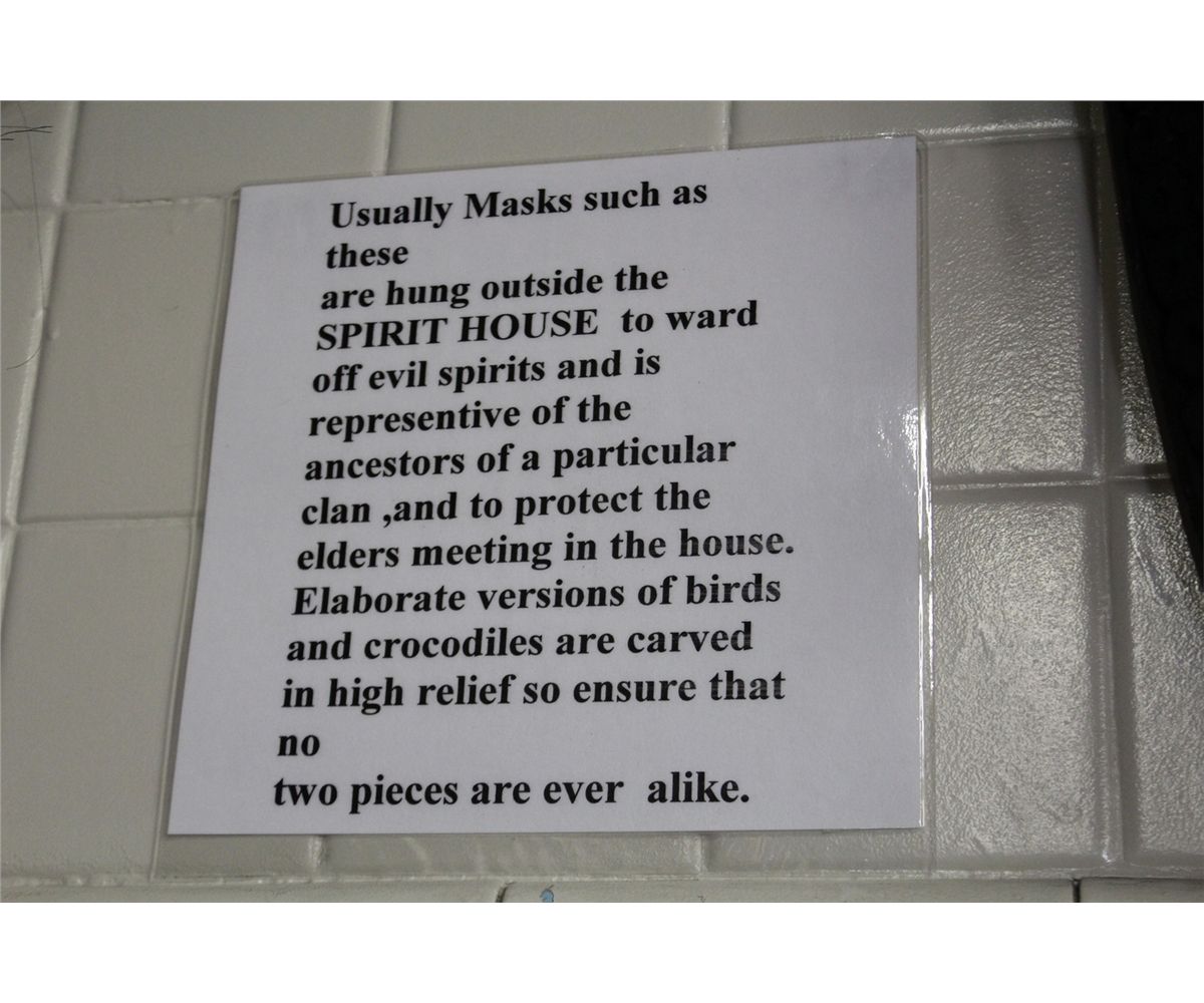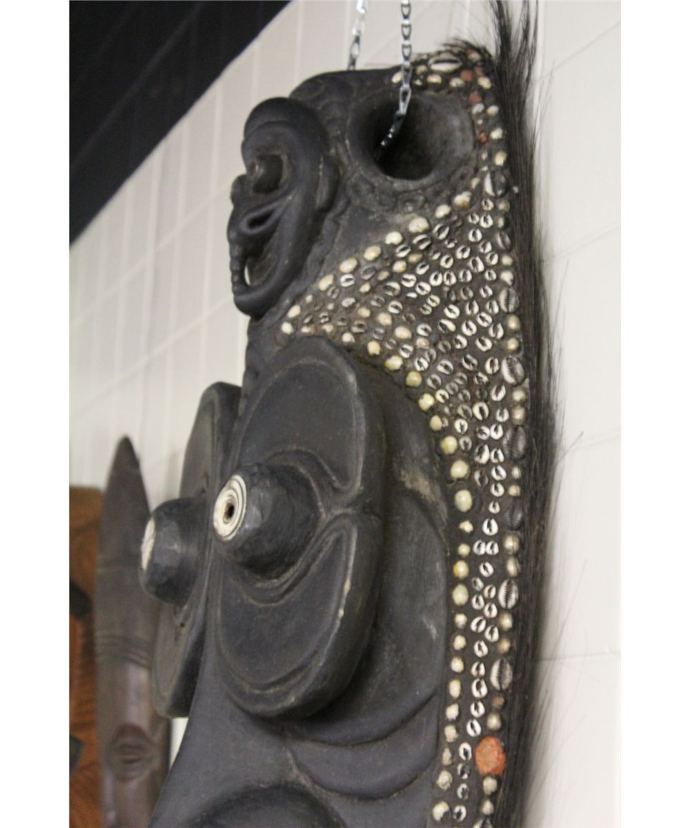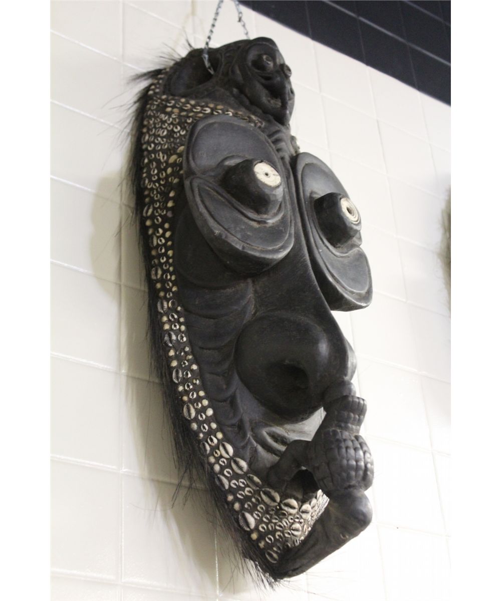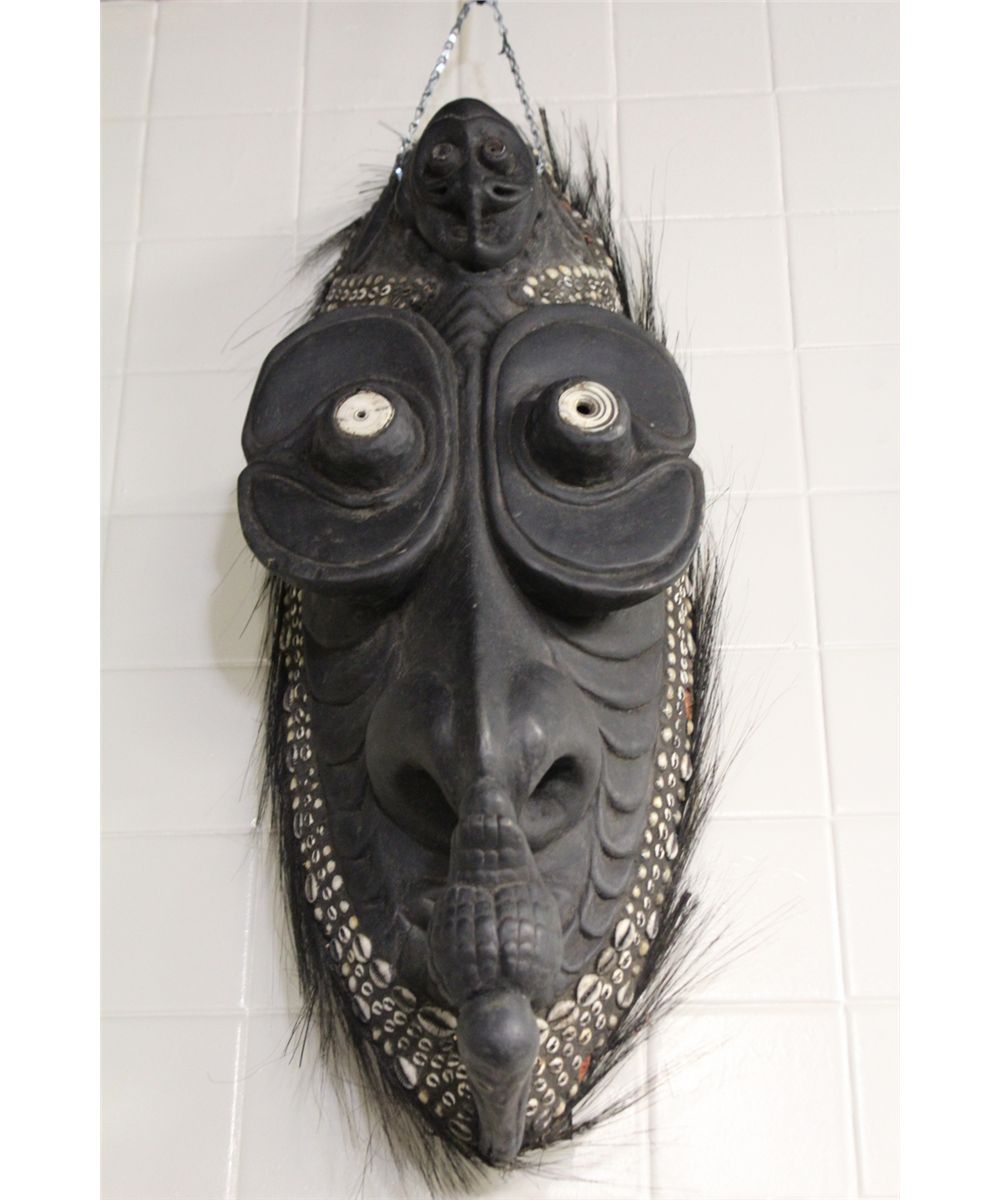 PAPAU NEW GUINEA CARVED WOODEN SPIRIT SPIRIT HOUSE MASK FEATURING NASSA SHELLS EMBEDDED IN DARK RESIN AROUND THE FACE AND FOREHEAD. THESE ELABORATE CARVINGS ARE MADE IN HIGH RELIEF SO TO ENSURE NO TWO PIECES ARE THE SAME. 28" HIGH 11" WIDE FEATURING A BIRD HANGING FROM THE NOSE AND BONE EYES.