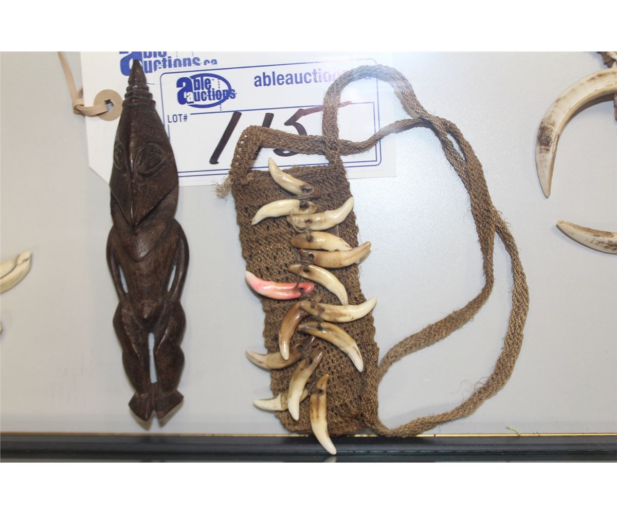PAPAU NEW GUINEA- ORIGINAL CARVING "LUCKY CHARM" WORN BY CHIEFS AND CLAN ELDERS AND VERY DIFFICULT TO OBTAIN. PURCHASED BY ERIC DIRECTLY FROM A CHIEF. INCLUDES DOG TEETH WITH SACK