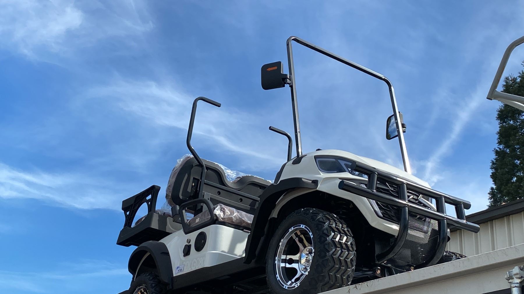 *PARTS ONLY* SDLANCH SDLGC80 WHITE 4 SEAT ELECTRIC GOLF CART WITH 4KW AC MOTOR, 50 MILE RANGE 23-24 MPH TOP SPEED, LED LIGHTS, LCD SCREEN, USB PORT, BLUETOOTH MEDIA SYSTEM, REAR BACKUP CAMERA, FULL LIGHTS, PNEUMATIC TIRES, & CONVERTER 110V CHARGING HAS KEY, CHARGER, TOOL KIT, FRONT WINDSHIELD & RAIN COVER* *ASSEMBLED, READY FOR TRANSPORTATION* **REQUIRES PARTS/REPAIR**