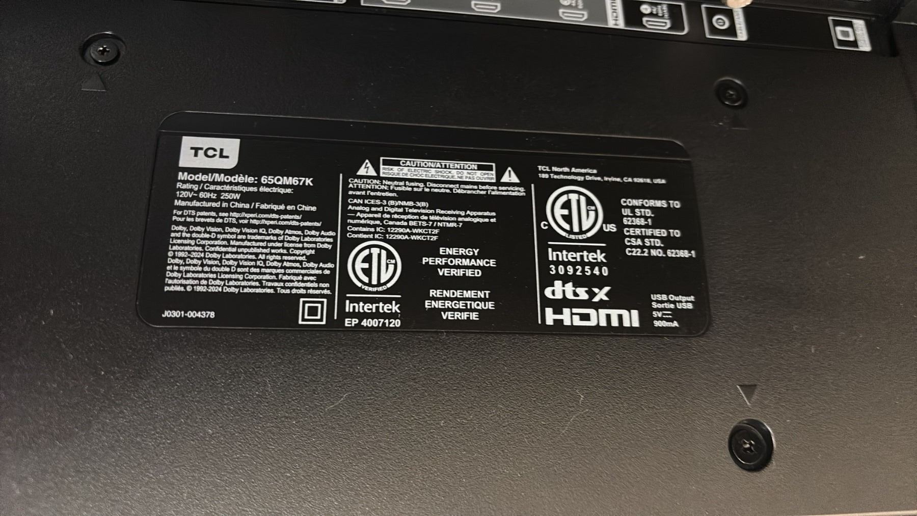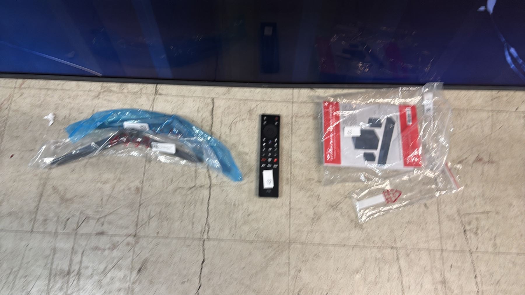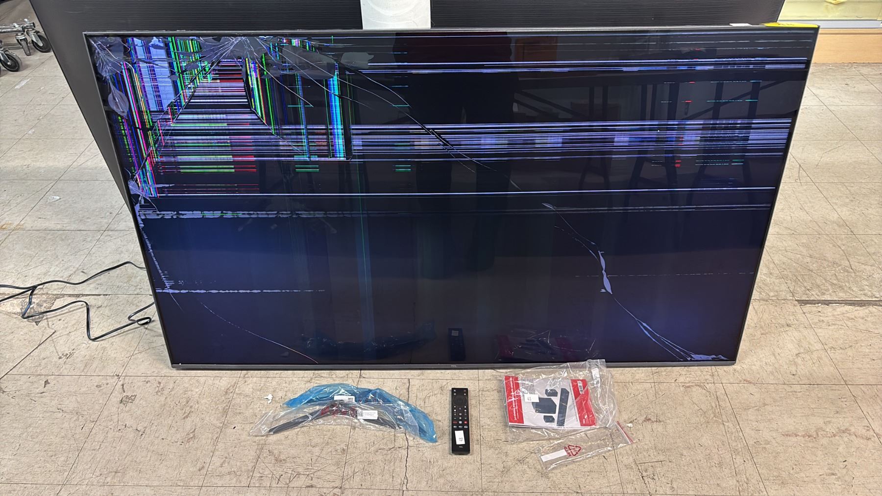 *PARTS & REPAIR, SCREEN DAMAGED* TCL 65" TV WITH POWER CORD, STAND & REMOTE