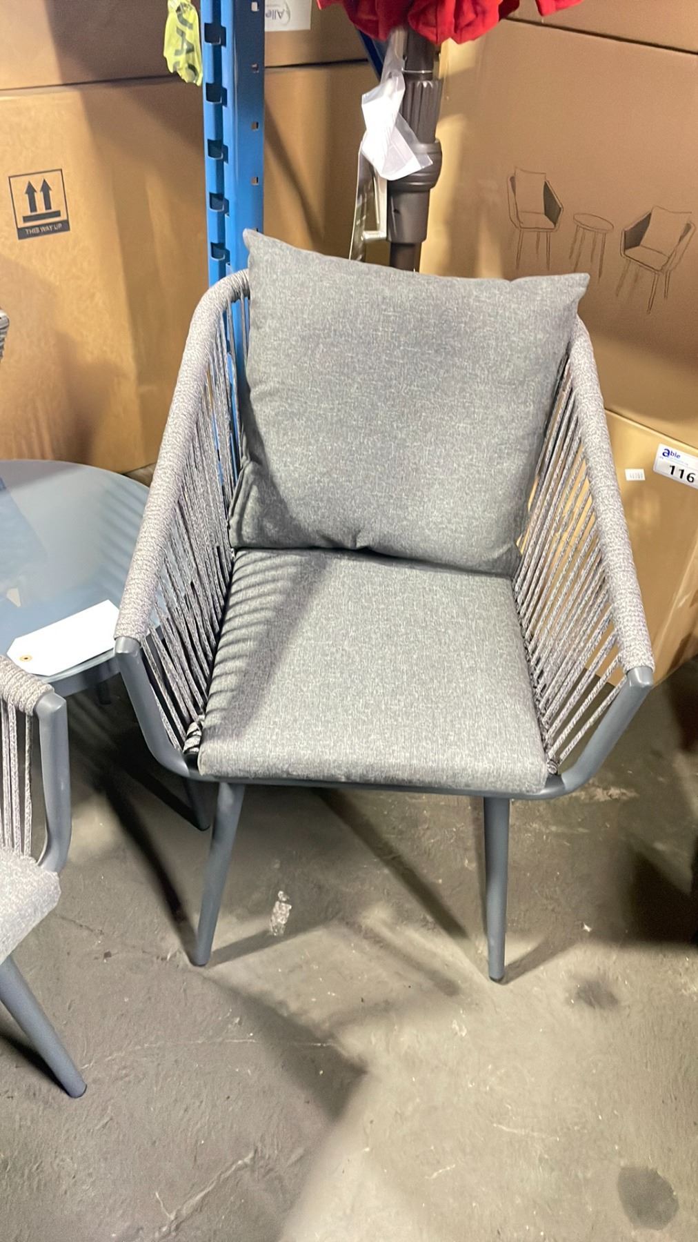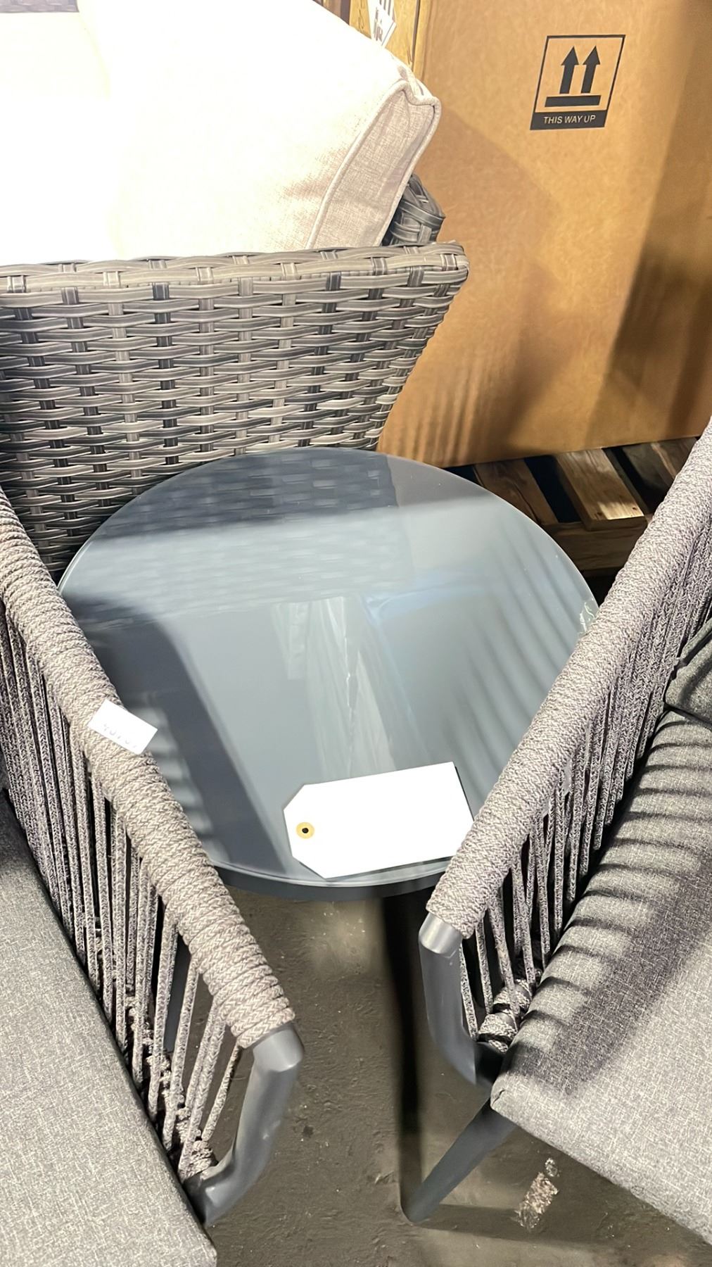 PATIO BLISS DARK GREY 3 PCS CORD WRAPPED GLASS TOP TABLE OUTDOOR PATIO CHAT SET WITH GREY CUSHIONS *IN BOX*