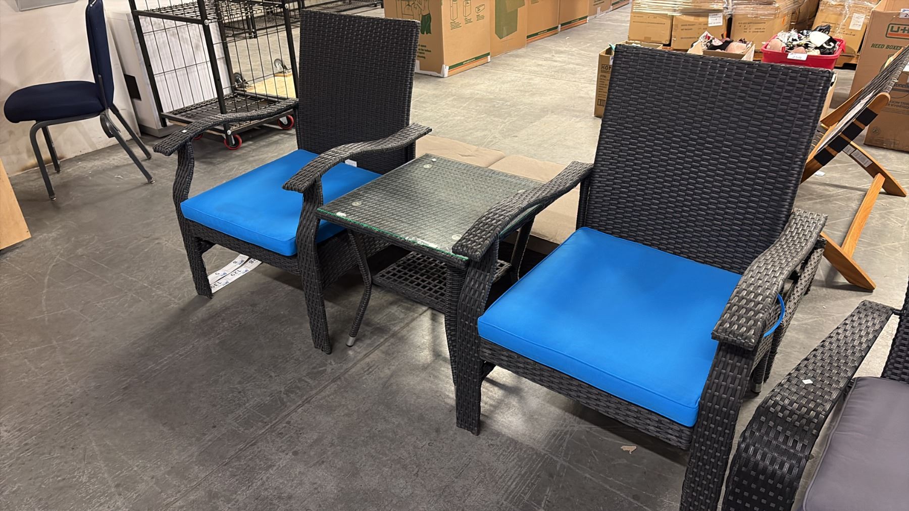 PATIO FLARE WHYLIE 3 PIECE CHAT SET WITH BLUE CUSHIONS
