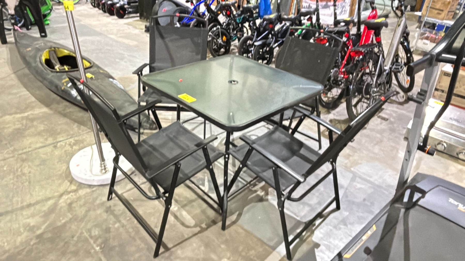 PATIO SET- 4 FOLDING CHAIRS AND GLASS TABLE