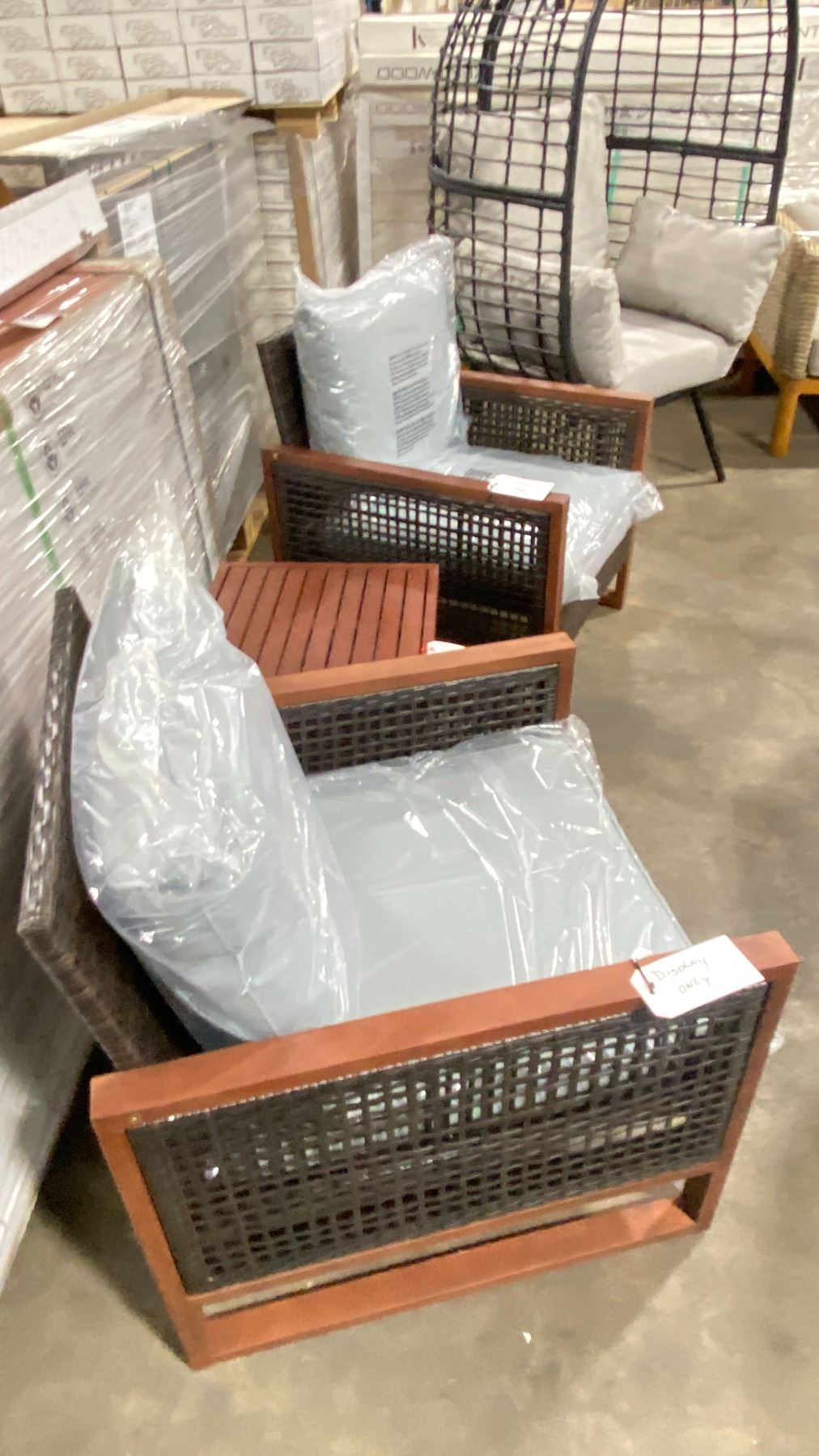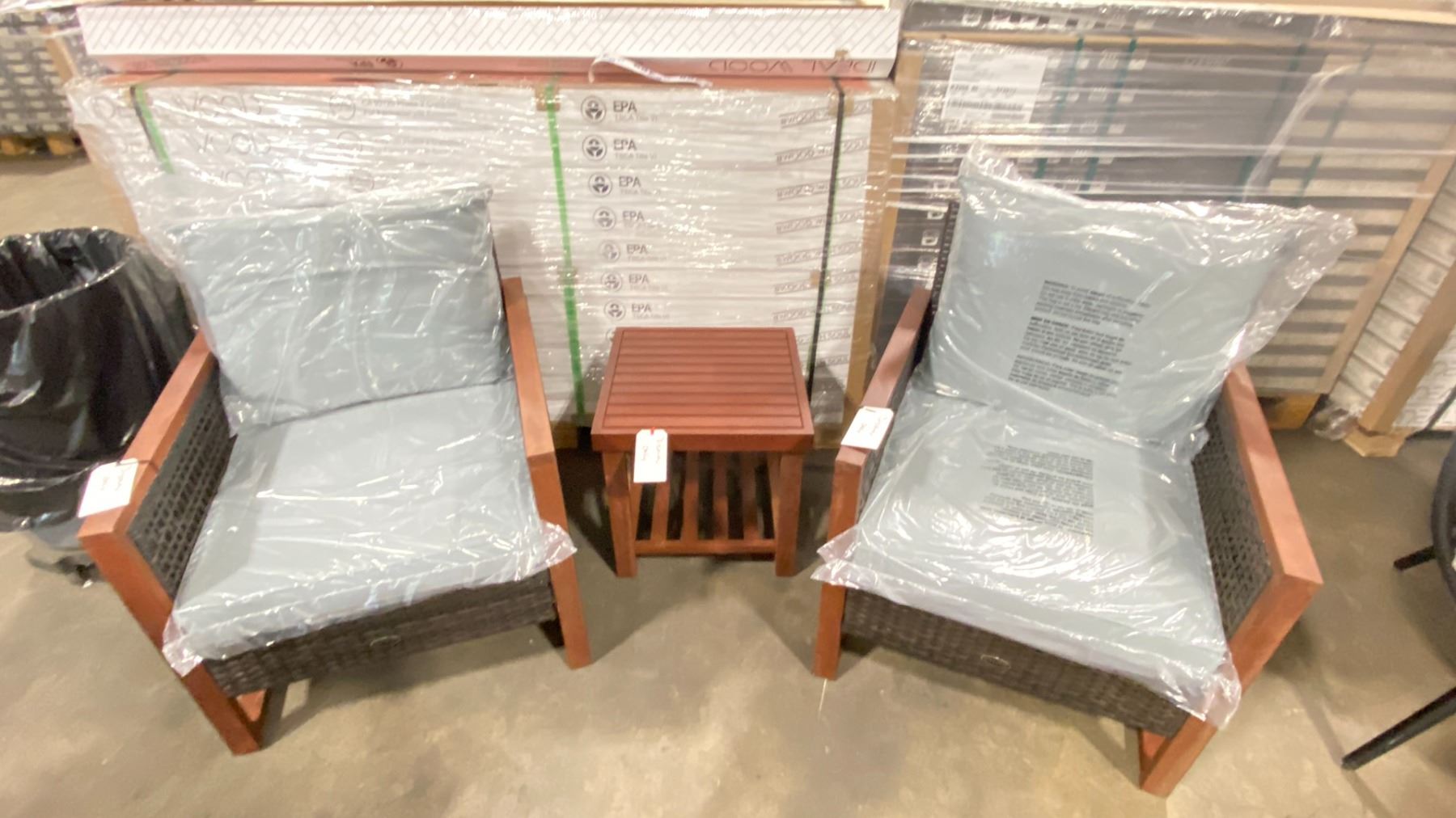 PATIOFLARE COLTON WOOD / PLASTIC RATTAN 3PCS OUTDOOR PATIO CHAT SET WITH GREY CUSHIONS INCLUDING: 2 ARM CHAIRS & 1 SIDE TABLE *IN BOX ( 1 BOX ONLY )*