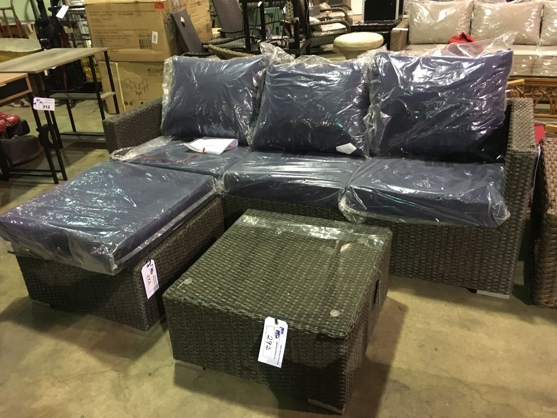 PATIOFLARE NICOLE GREY RATTAN / BLUE CUSHION 3 SEAT OUTDOOR PATIO SOFA SET WITH OTTOMAN & SIDE TABLE