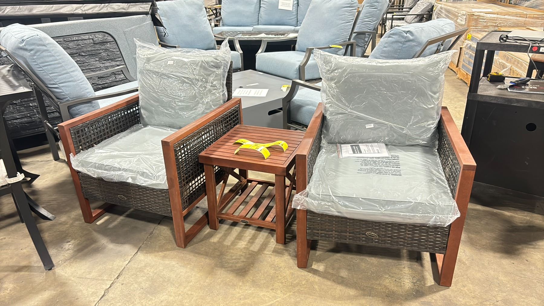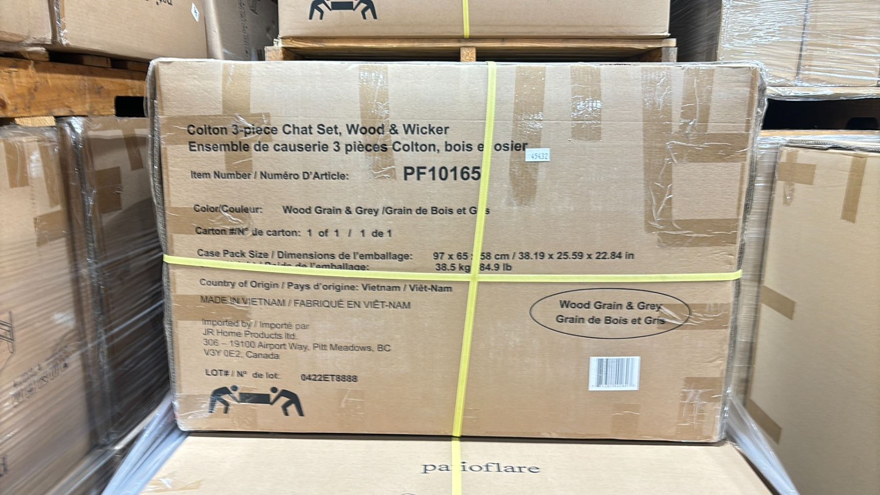 PATIOFLARE PF10165 COLTON 3PCS WOOD & PLASTIC RATTAN OUTDOOR PATIO CHAT SET WITH GREY CUSHIONS *IN BOX*
