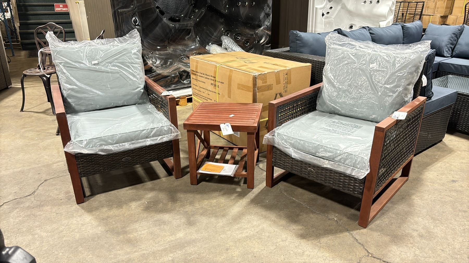 PATIOFLARE PF10165 COLTON 3PCS WOOD & PLASTIC RATTAN OUTDOOR PATIO CHAT SET WITH GREY CUSHIONS *IN BOX*