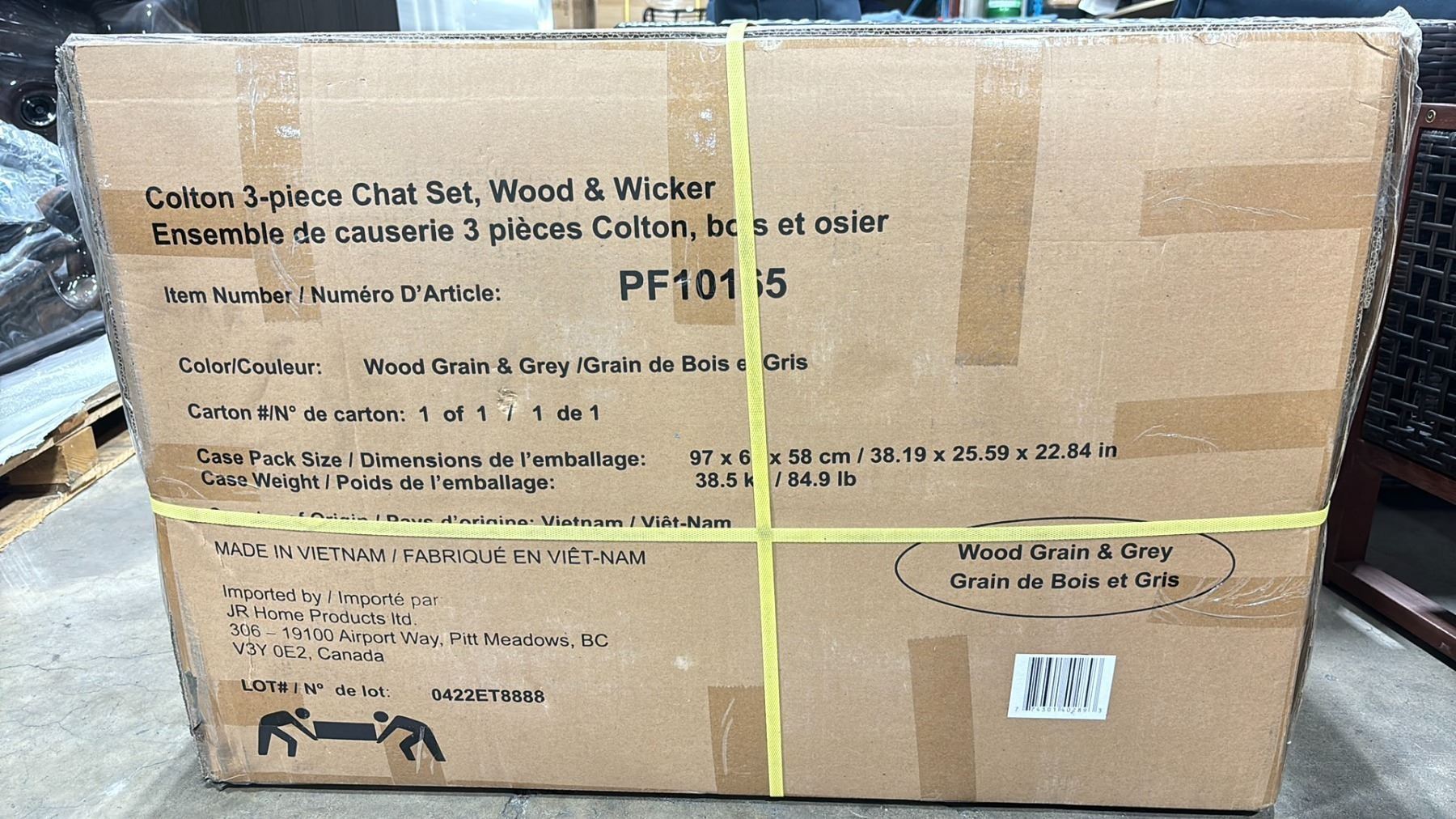 PATIOFLARE PF10165 COLTON 3PCS WOOD & PLASTIC RATTAN OUTDOOR PATIO CHAT SET WITH GREY CUSHIONS *IN BOX*
