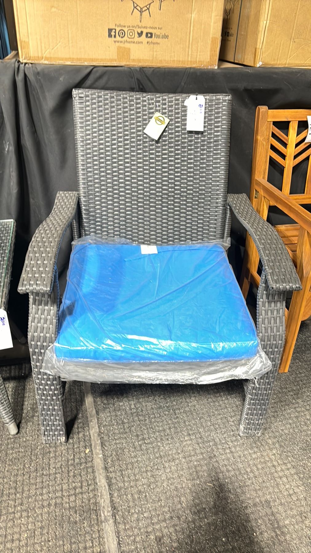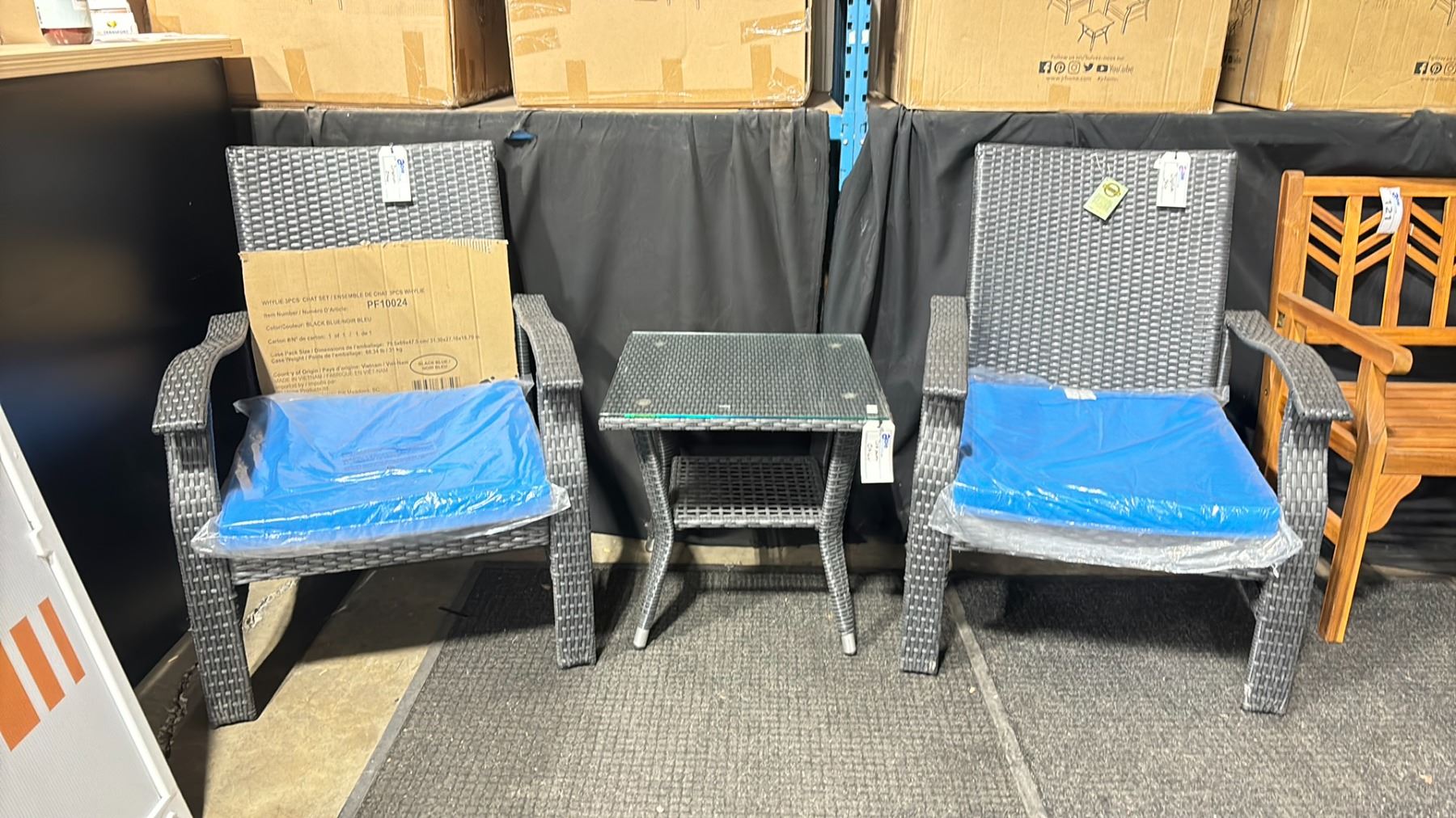 PATIOFLARE WHYLIE PF10024 BLACK 3PCS PLASTIC RATTAN OUTDOOR PATIO CHAT SET WITH BLUE CUSHIONS *IN BOX*