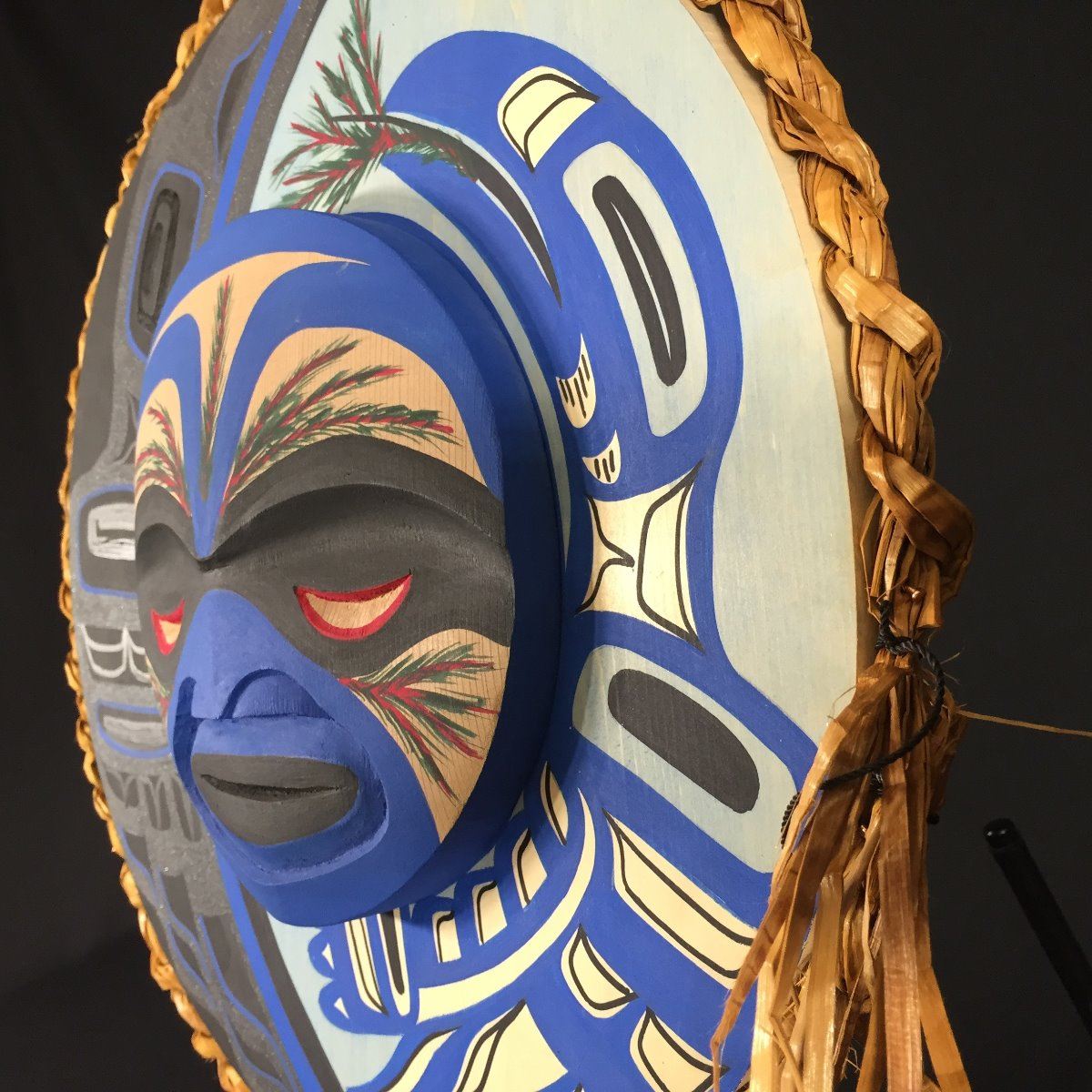 PATRICK AMOS, NUU-CHAH-NULTH, "LADY CROW AND RAVEN" MOON MASK, WITH CEDAR BARK 15" DIAMETER