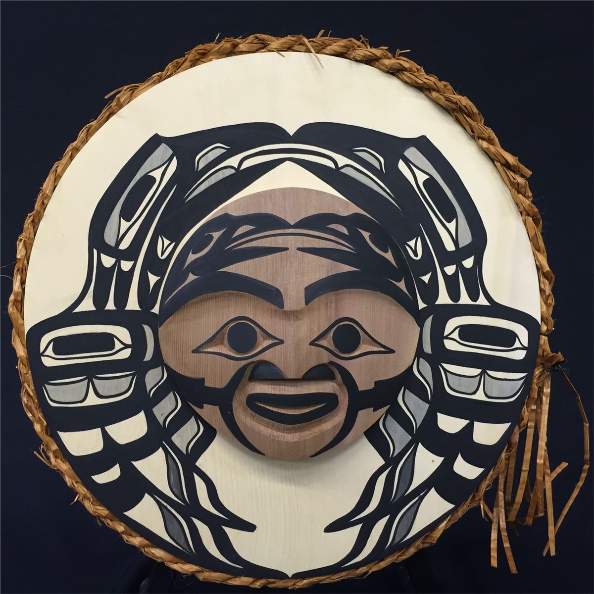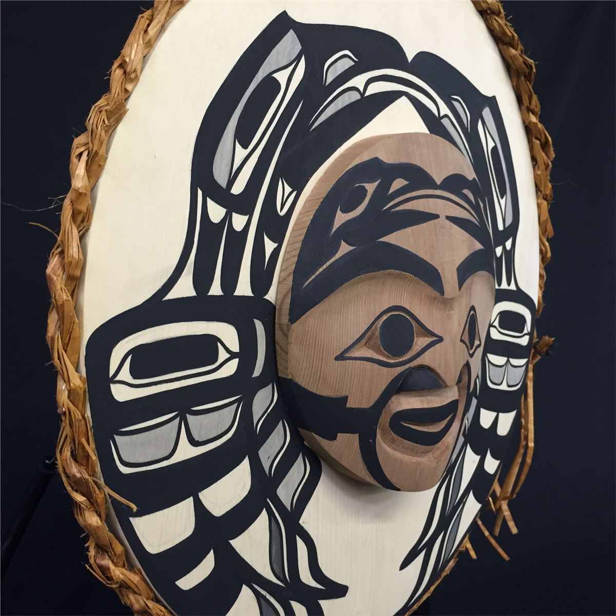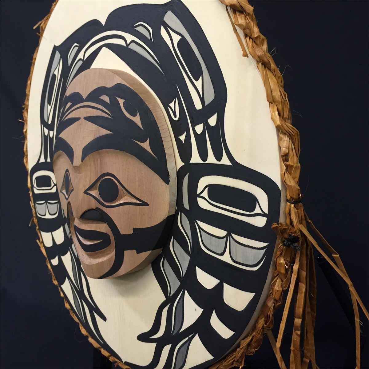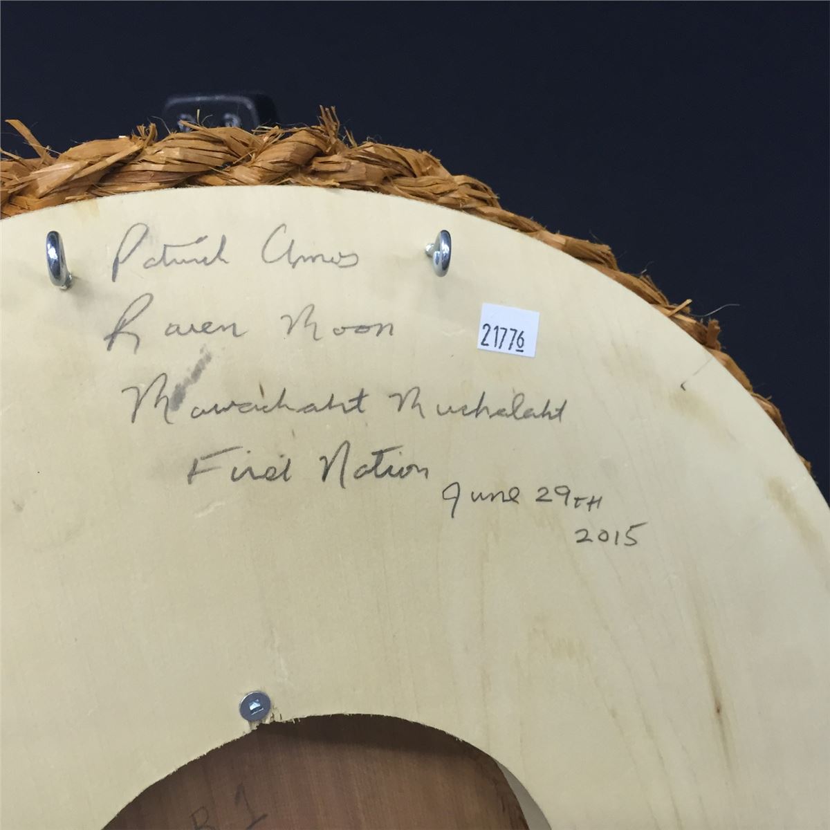 PATRICK AMOS, NUU-CHAH-NULTH, "RAVEN MOON" MASK, WITH CEDAR BARK 15" DIAMETER