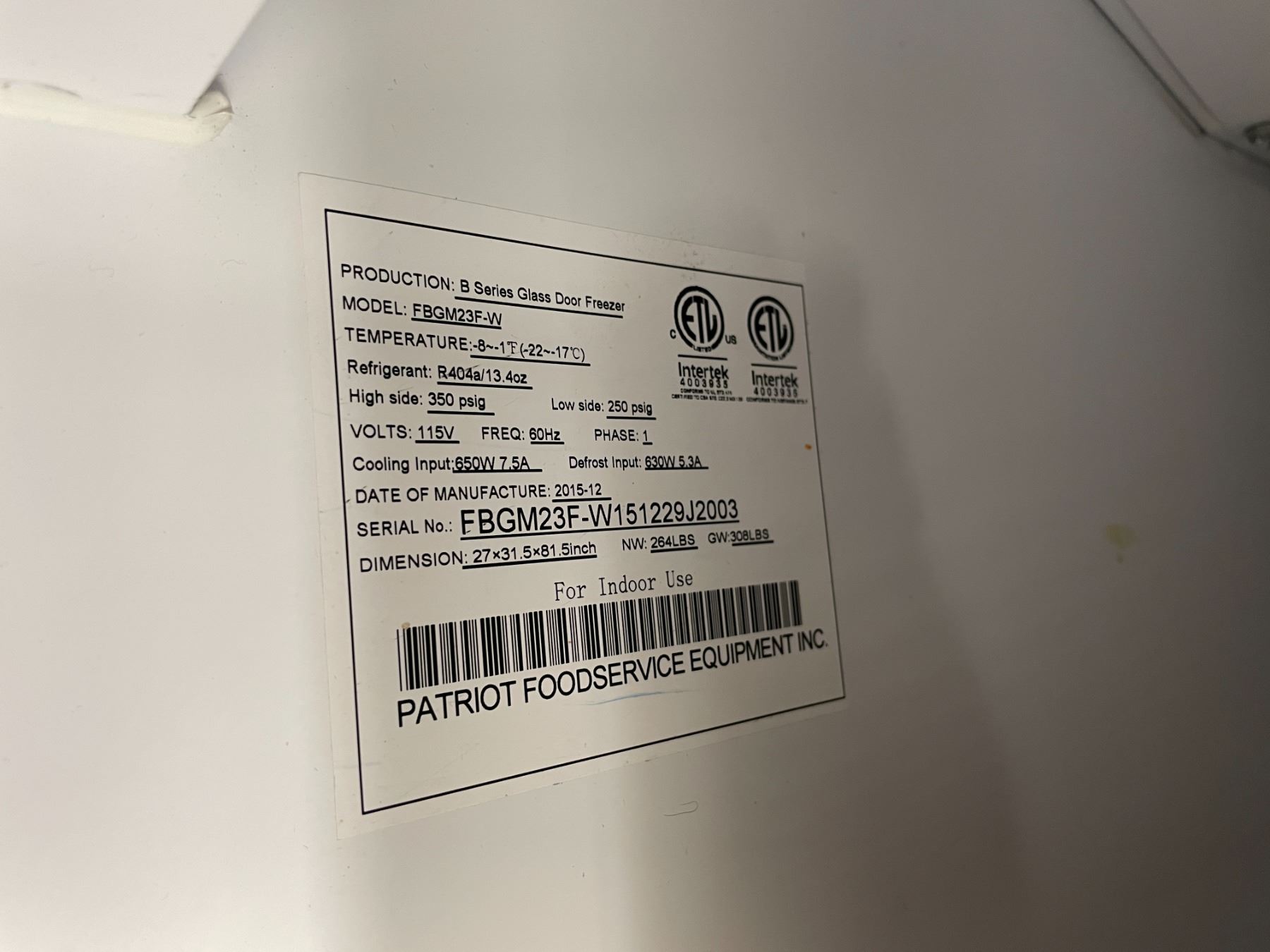 PATRIOT FOOD SERVICES EQUIPMENT FBGM23F-W B SERIES SINGLE DOOR COMMERCIAL GLASS FRONT FREEZER