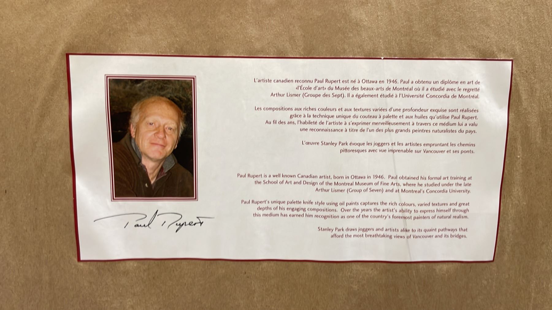 PAUL RUPERT "STANLEY PARK" FRAMED 16.5" X 14.5" SIGNED PRINT - ARTIST INFO ON BACK