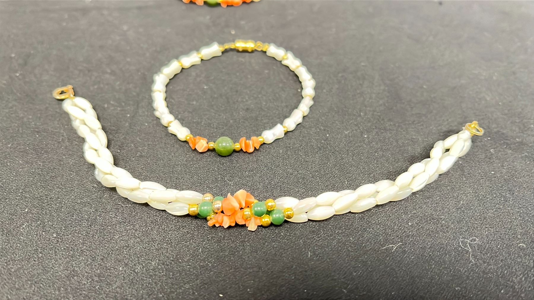 PEARL CORAL JADE NECKLACE EARRINGS BRACELET SET ADJUSTABLE JADE RING