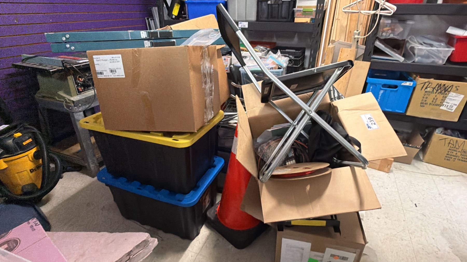 PILE OF ASSORTED ITEMS INCLUDING; RESERVED FOLDING CHAIRS, SAW HORSES & MORE *MUST TAKE ALL*