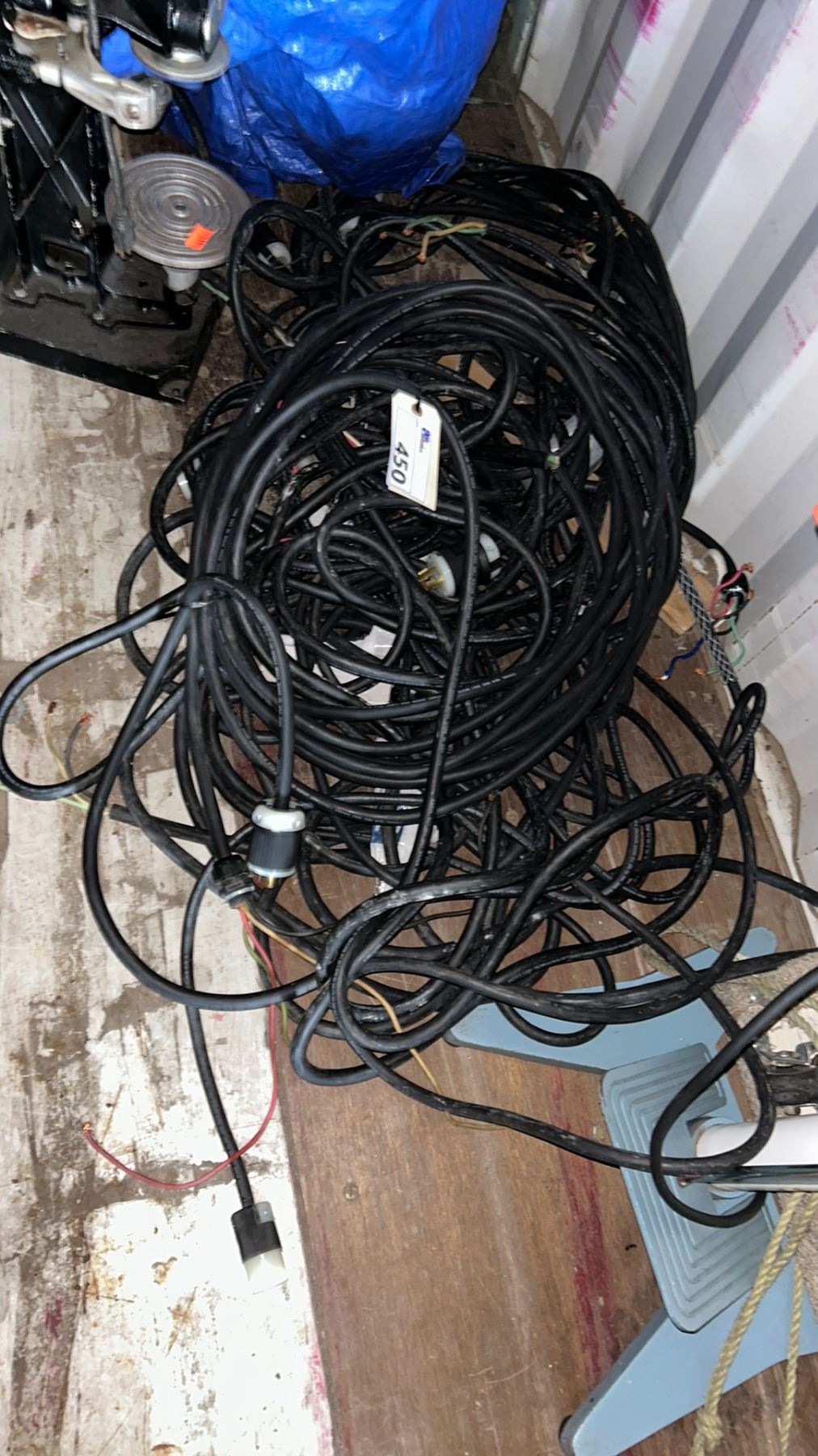 PILE OF EXTENSIONS CORDS, HEAVY GAUGE WIRE WITH 220V ENDS, ASST LENGTHS LOCATED IN CONTAINER