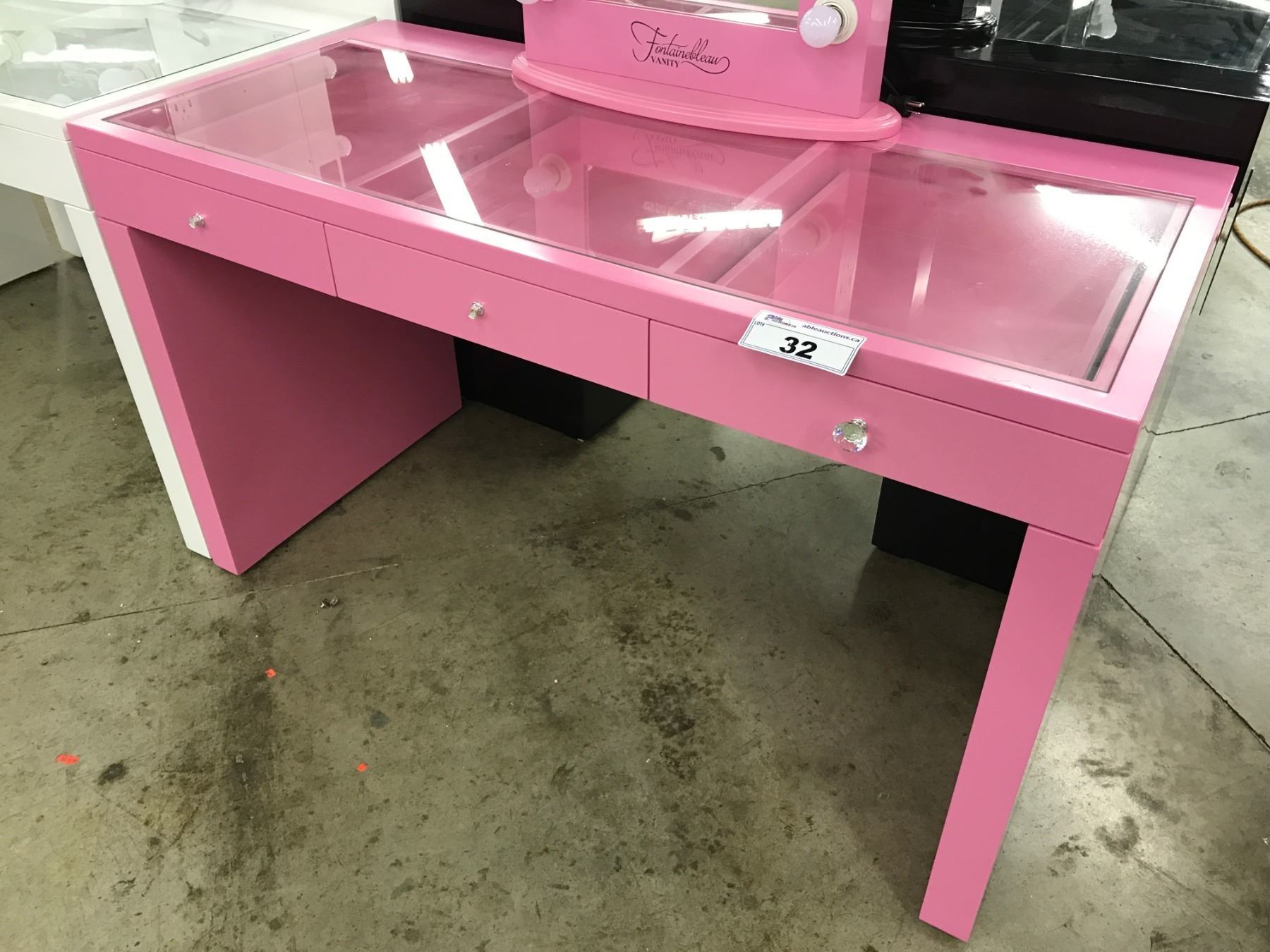 PINK 13 DRAWER GLASS TOP VANITY, 51" WIDE X 23.5" DEEP X 33" TALL, MIRROR NOT INCLUDED