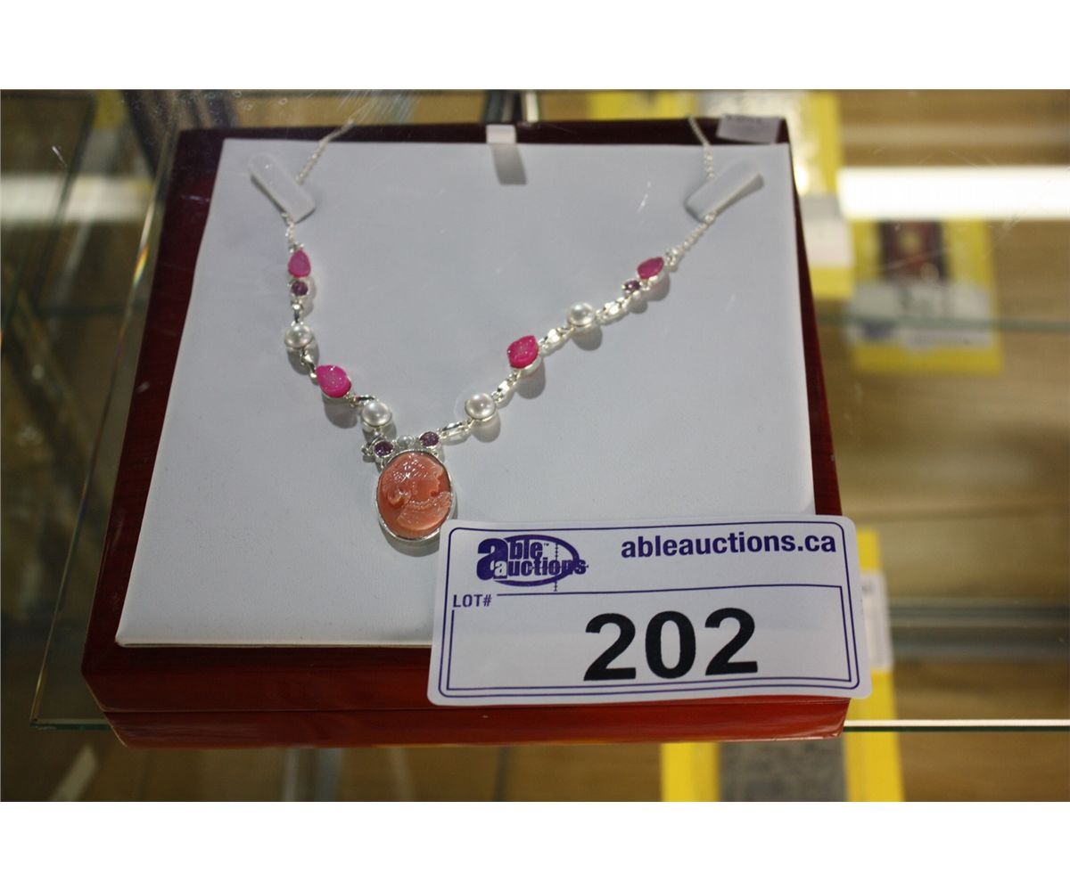 PINK KUNZITE, CORAL, PEARL AND DRUZY CAMEO NECKLACE IN STERLING SILVER