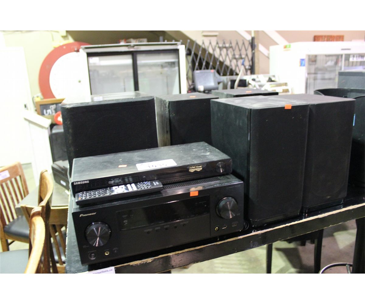 PIONEER RECEIVER, SAMSUNG DVD PLAYER, SUBWOOFER AND 4 SPEAKERS