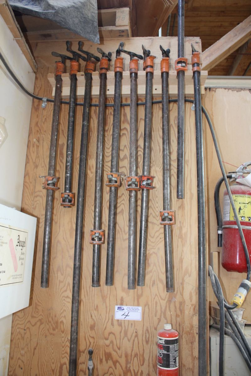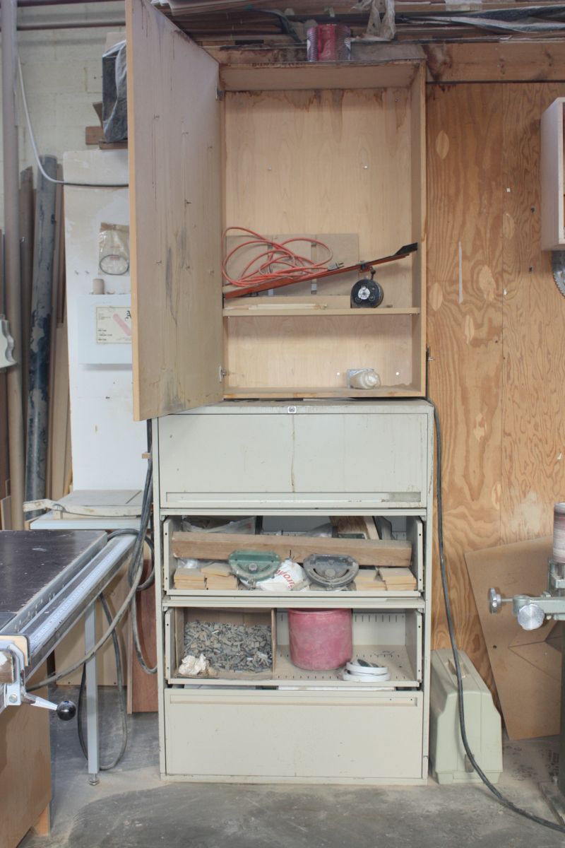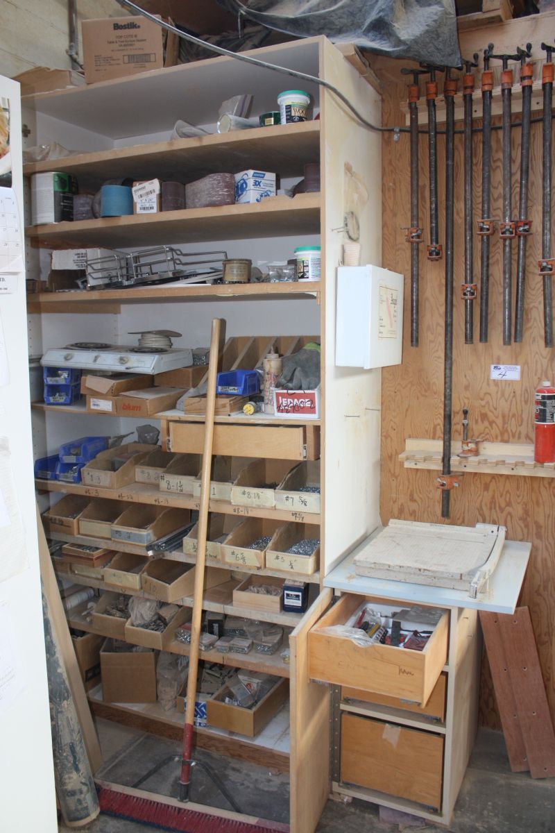 PIPE CLAMPS AND 4 CABINETS WITH ASSORTED HARDWARE AND TOOLS