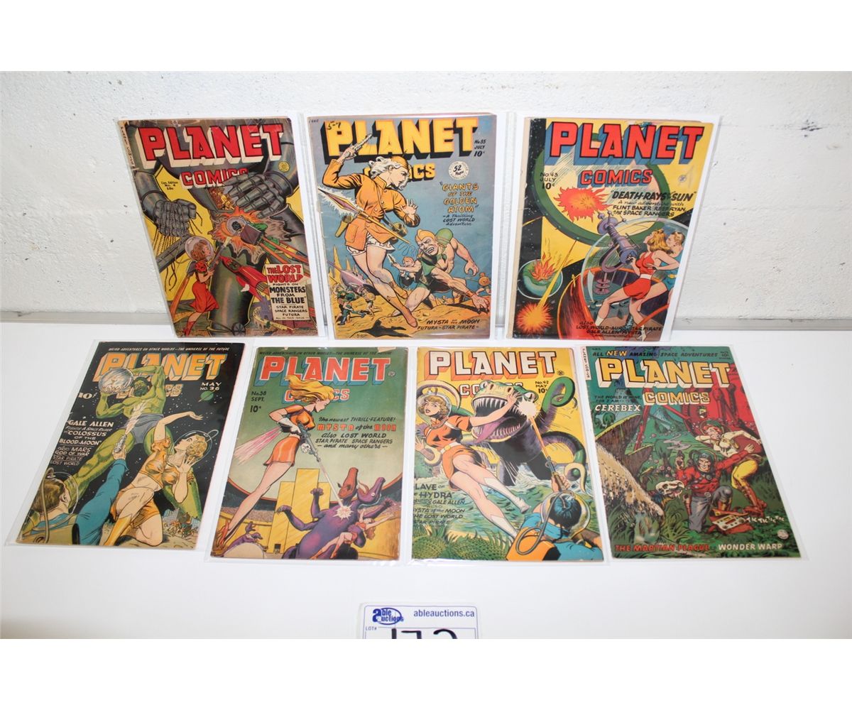 PLANET COMICS GOLDEN AGE RUN (1940-53) #4, 36, 38, 42-43, 55 & 57. A RARE OPPORTUNITY TO ACQUIRE 7 PRECODE ISSUES OF THIS CLASSIC SCI-FI SERIES.OVERALL A VERY SOLID MID GRADE AVERAGE WITH LOTS OF GLOSS & VERY SUPPLE PAGES #4 IS THE LOWEST GRADE. WITH SPINE SPLITTING, DETACHED COVER BUT SOLID OTHERWISE. A GORGEOUS RUN!