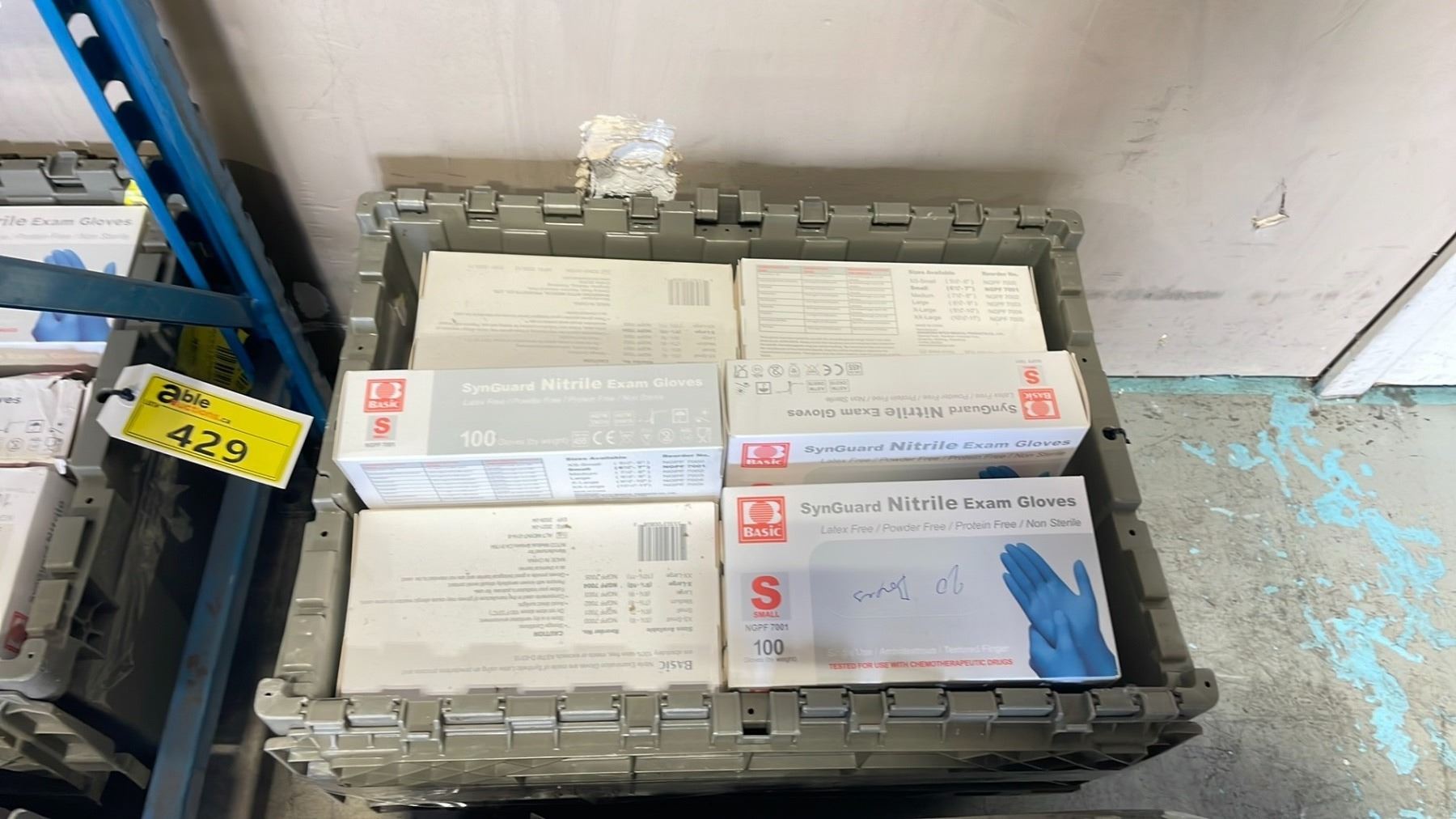 PLASTIC BIN OF 20 BOXES OF BASIC SIZE SMALL 100 PACK SYNGUARD NITRILE EXAM GLOVES