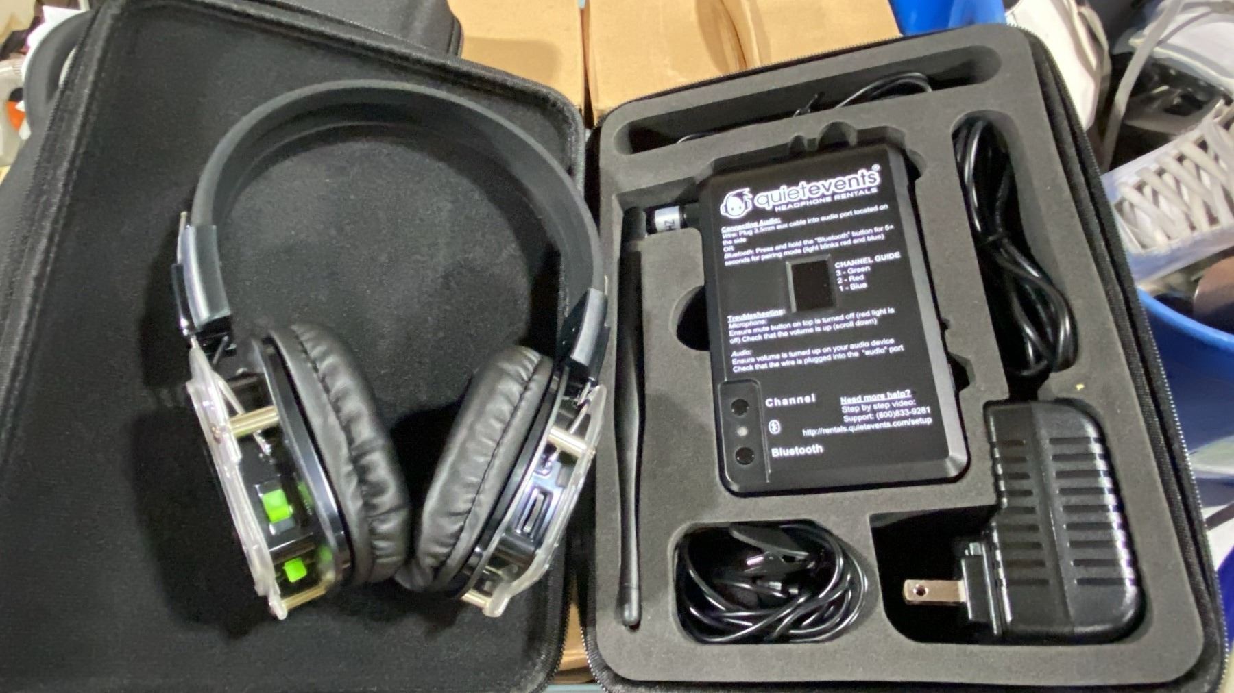PLASTIC BIN OF ASSORTED COMMERCIAL QUIET EVENTS SYSTEM HEADSETS & PARTS *BIN INCLUDED*