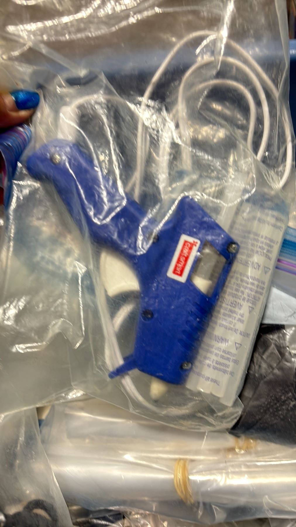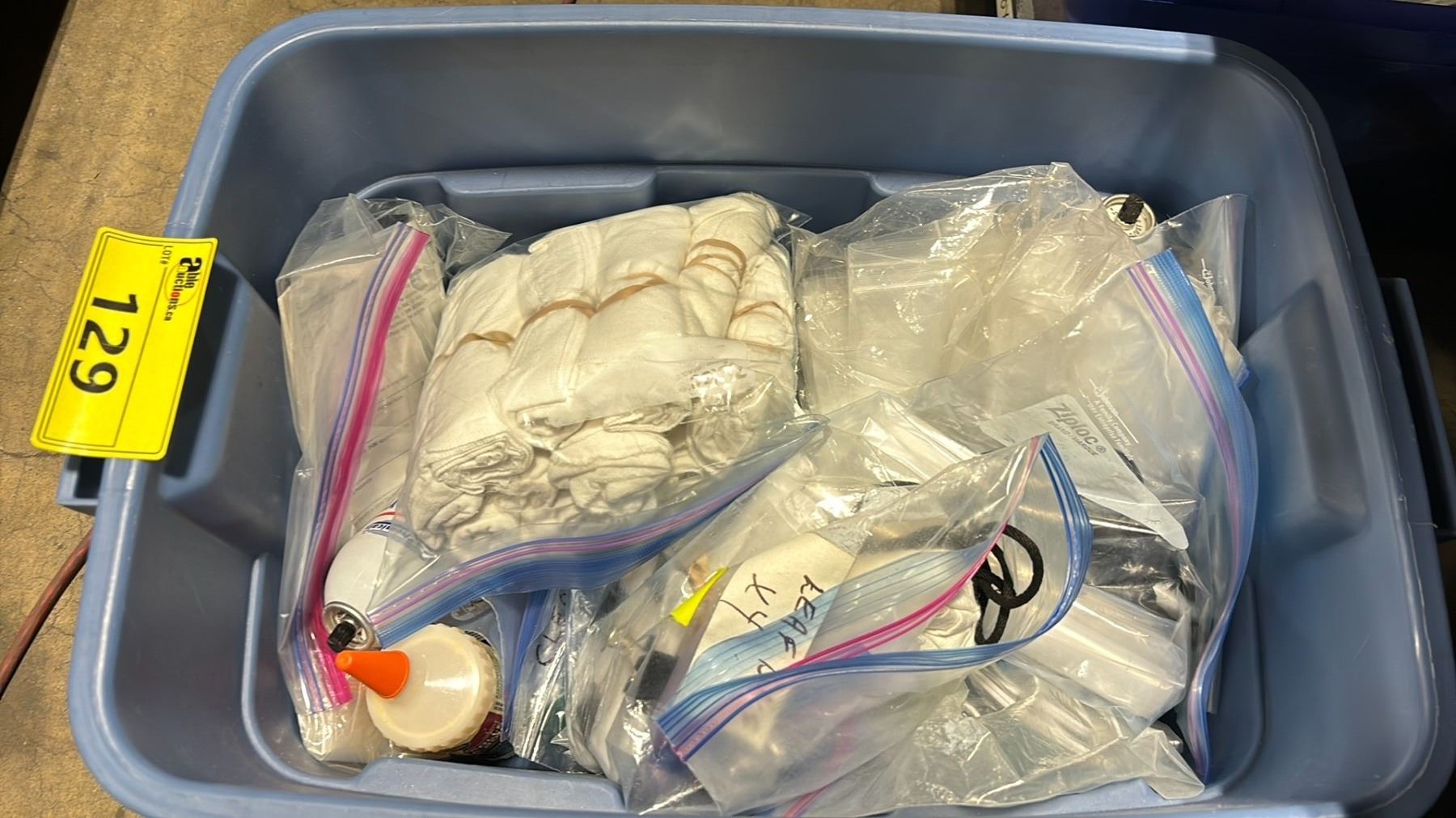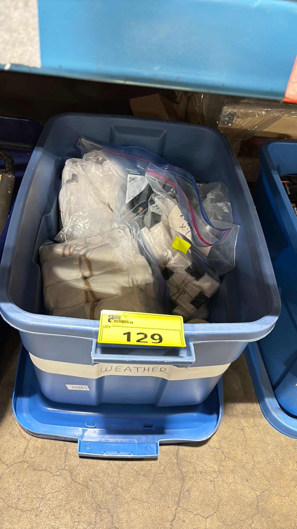 PLASTIC BIN OF ASSORTED LEAF BAGS, DRAPE CLOTHS, GLUE & SET UP MATERIAL *BIN INCLUDED*