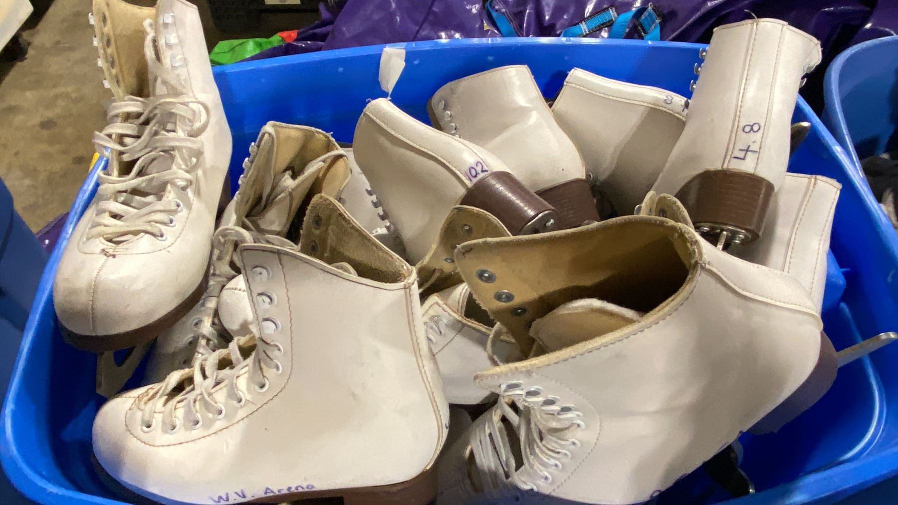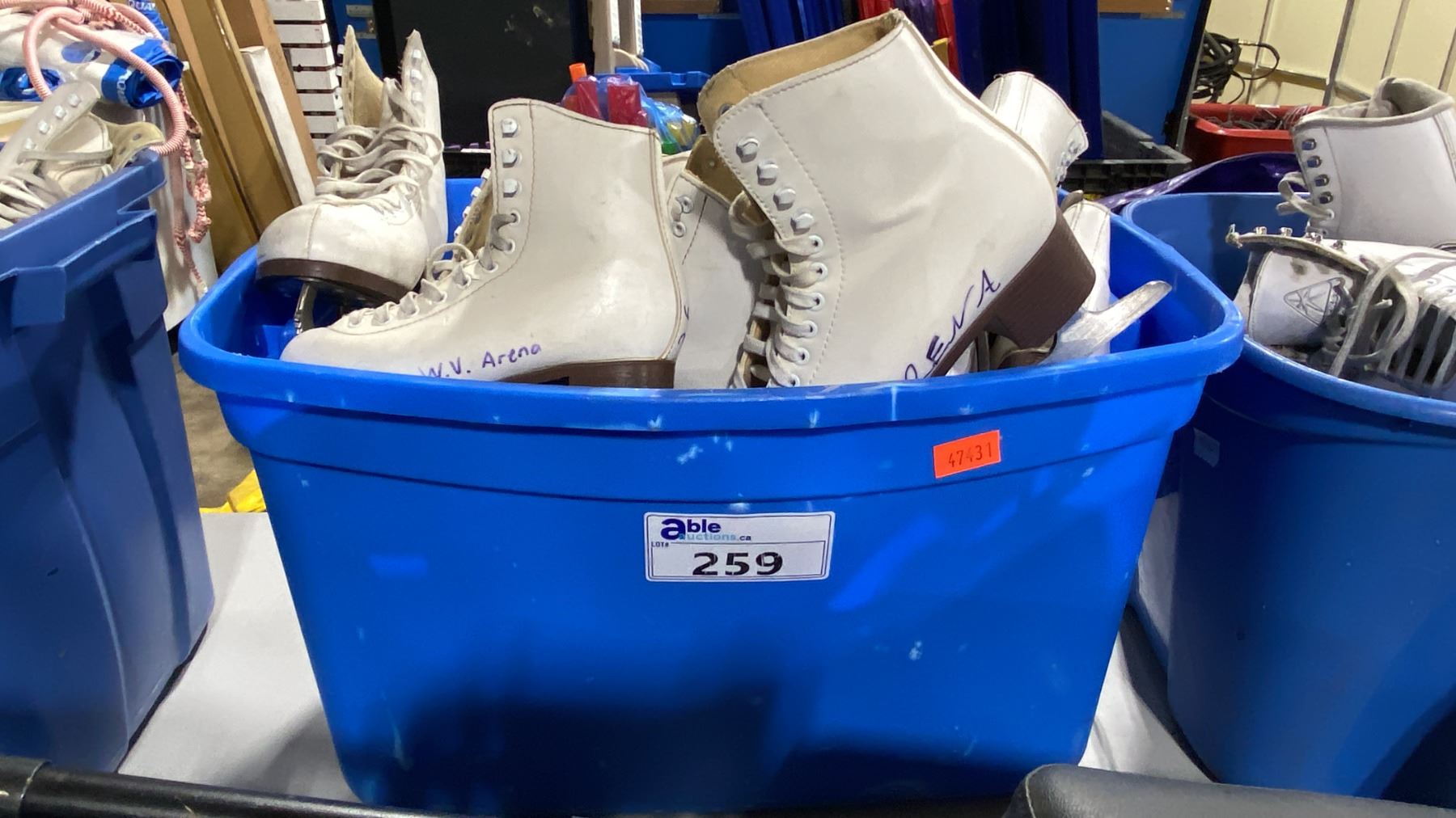 PLASTIC BIN OF ASSORTED PAIRS OF RENTAL LADIES ICE SKATES *BIN INCLUDED*