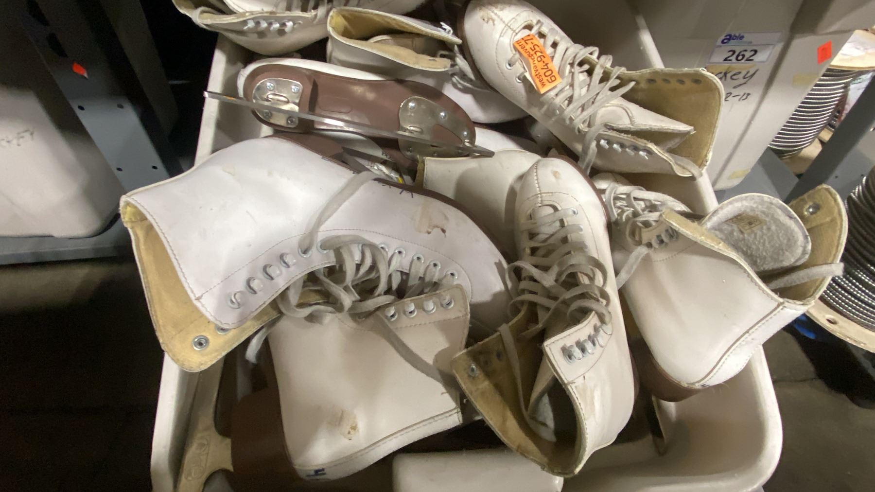 PLASTIC BIN OF ASSORTED PAIRS OF RENTAL LADIES ICE SKATES *BIN INCLUDED*