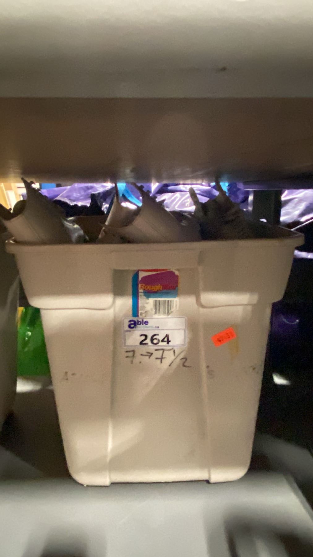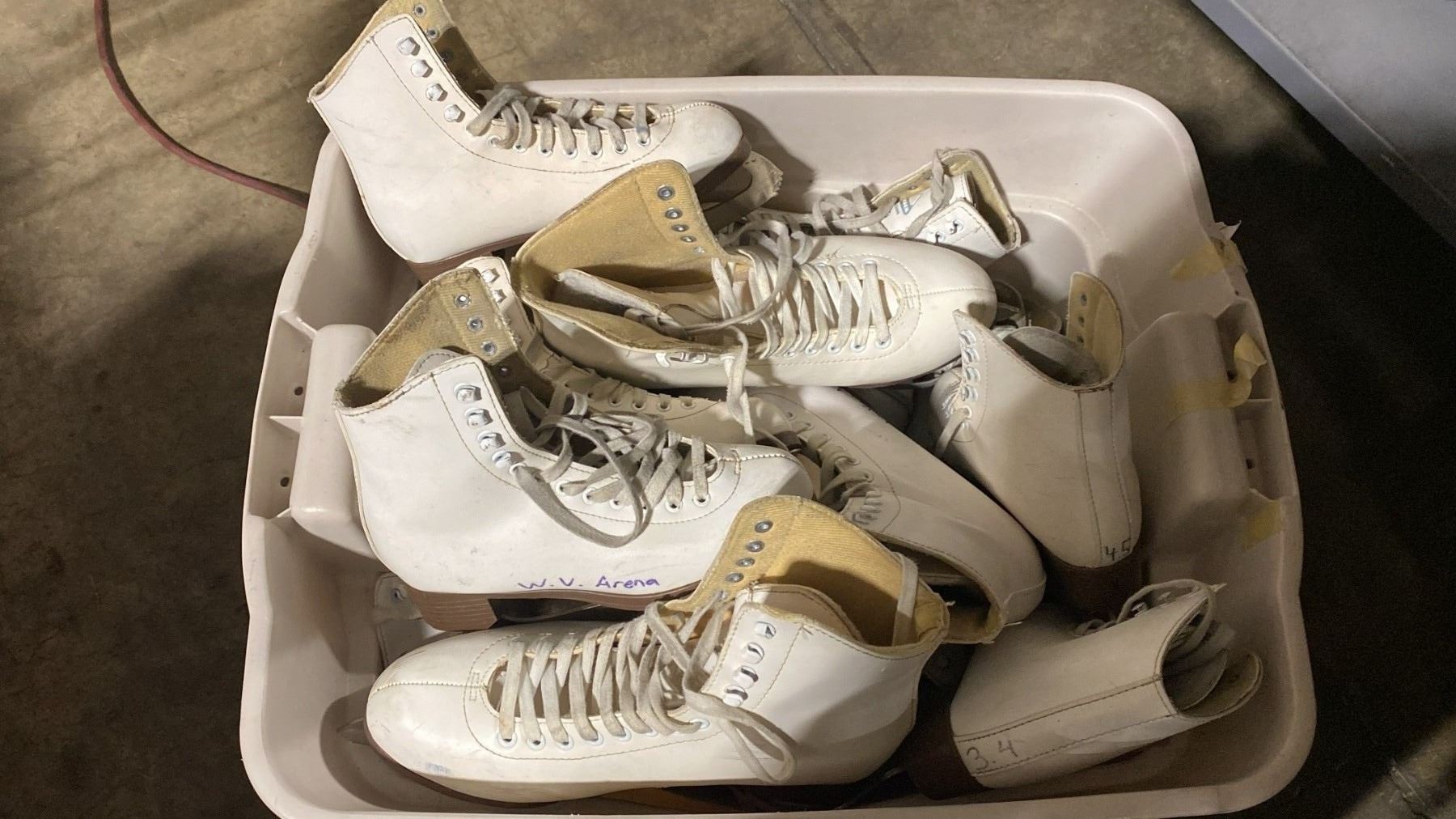 PLASTIC BIN OF ASSORTED PAIRS OF RENTAL LADIES ICE SKATES *BIN INCLUDED*