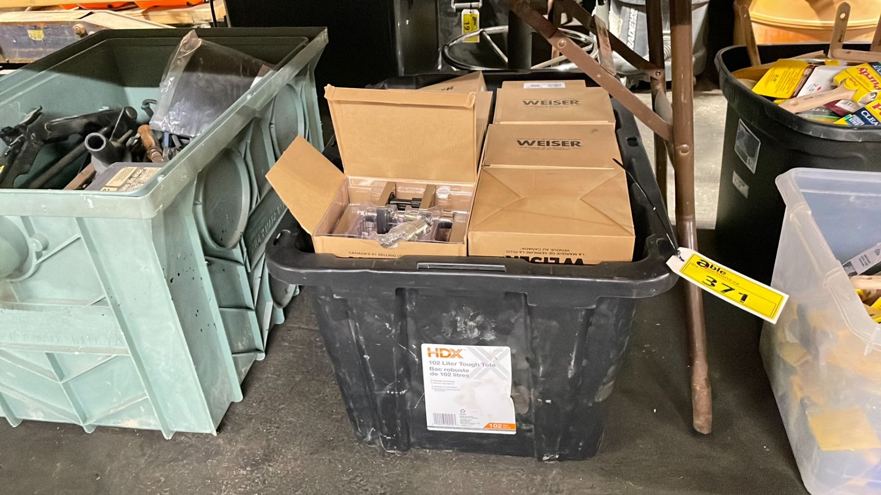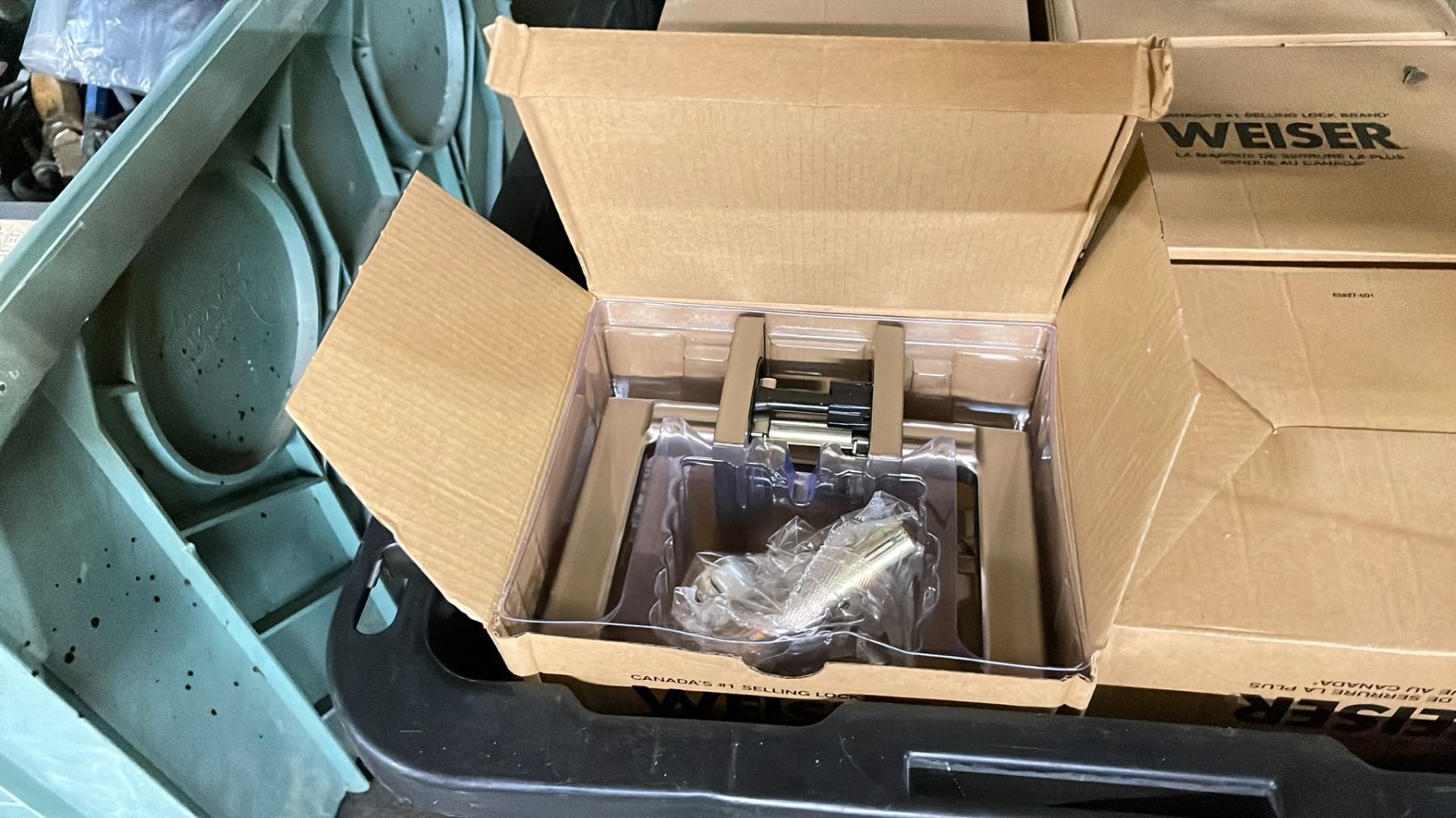 PLASTIC BIN OF ASSORTED WEISER LOCKING DOOR HANDLES *BIN INCLUDED*