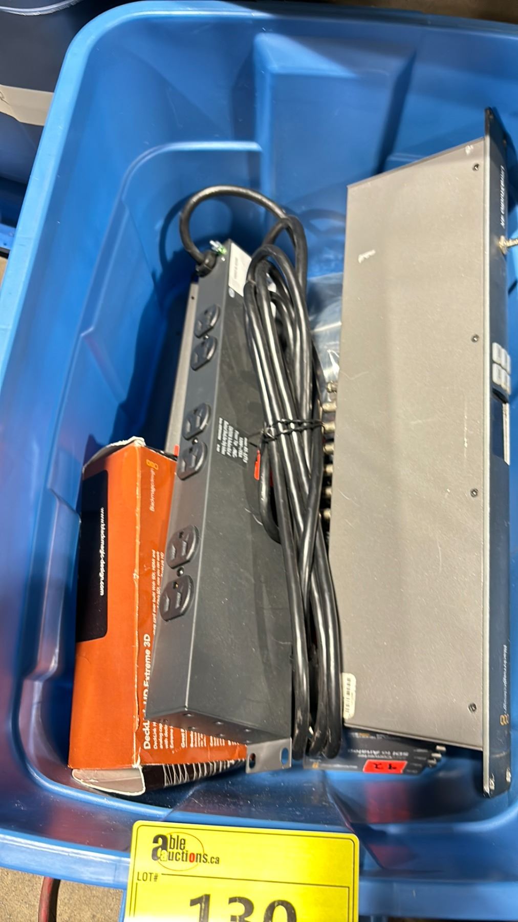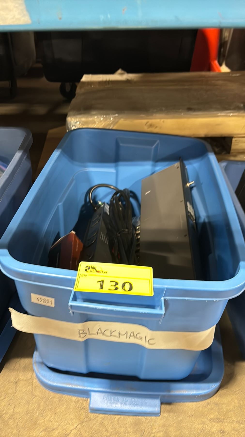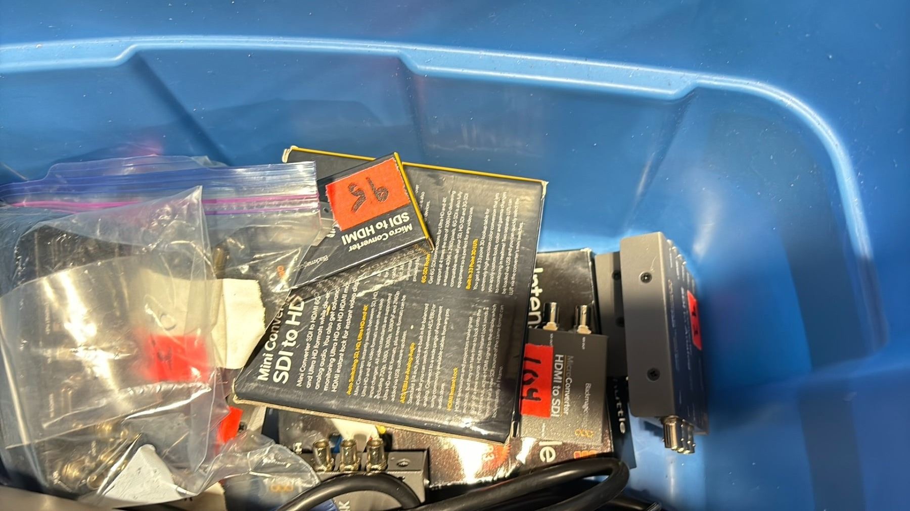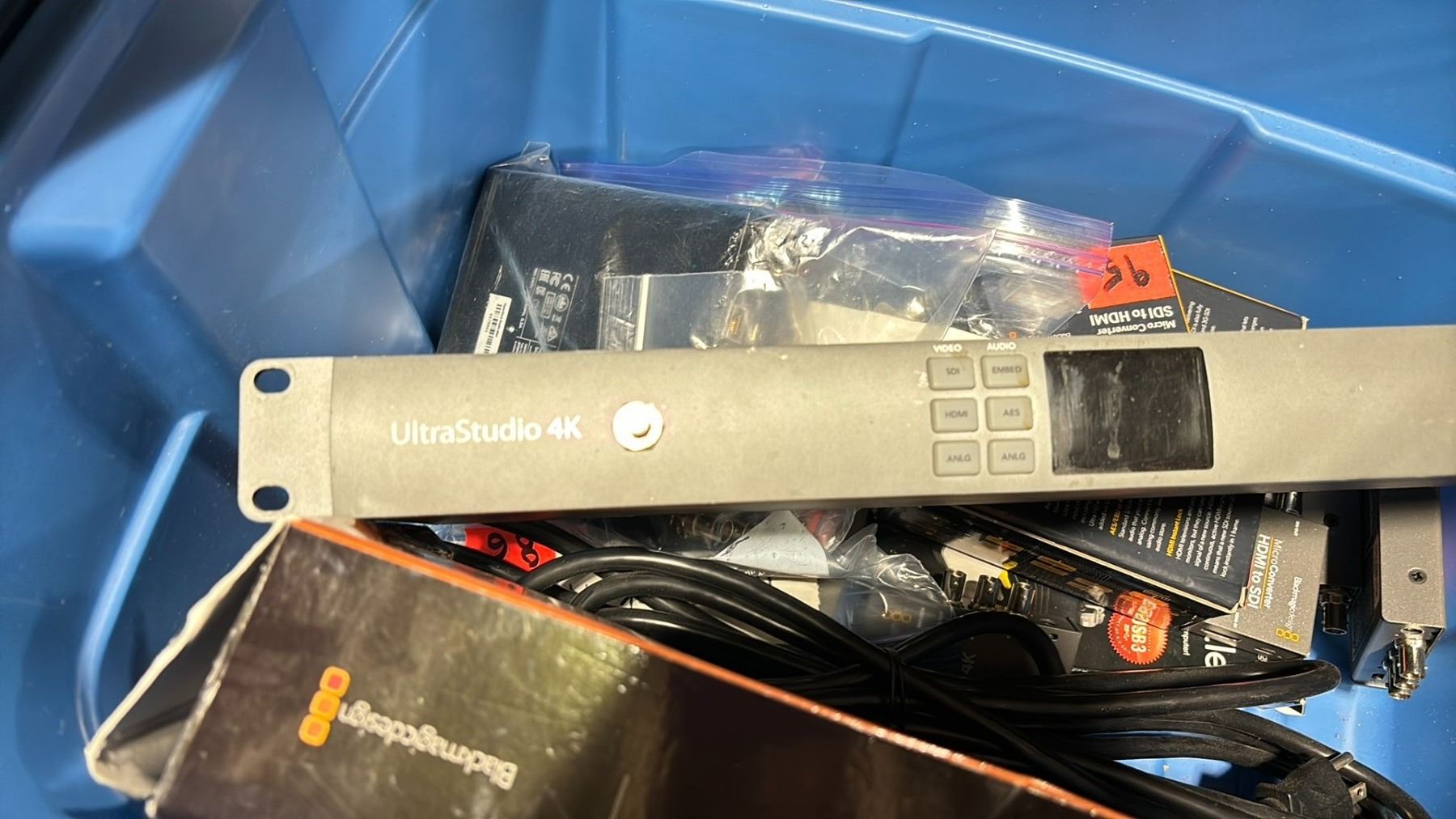 PLASTIC BIN OF DECKLINK HD EXTREME 3D, BLACKMAGIC RACK MOUNTED ULTRASOUND 4, HDMI TO SDI CONVERTERS & ASSORTED CABLES / PARTS *BIN INCLUDED*