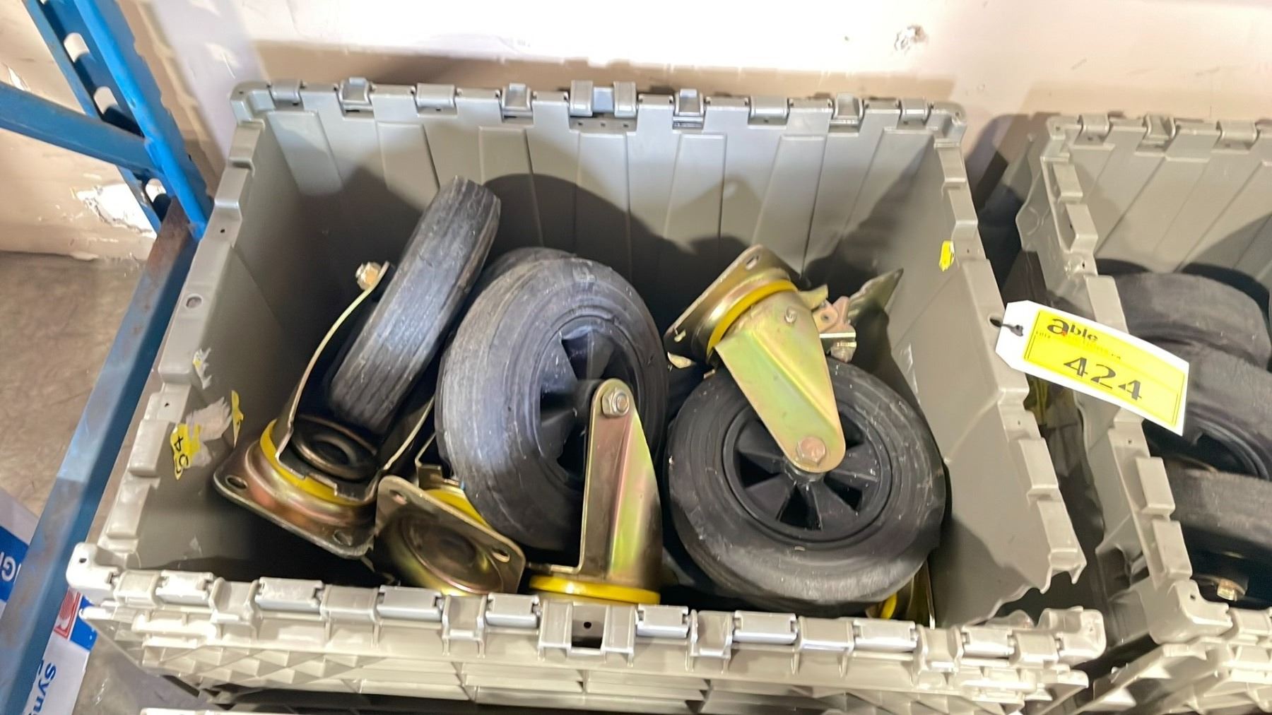 PLASTIC BIN WITH 2 SETS OF 4 RUBBER 8  INDUSTRIAL REPLACEMENT CASTERS WITH 4 LOCKING CASTERS